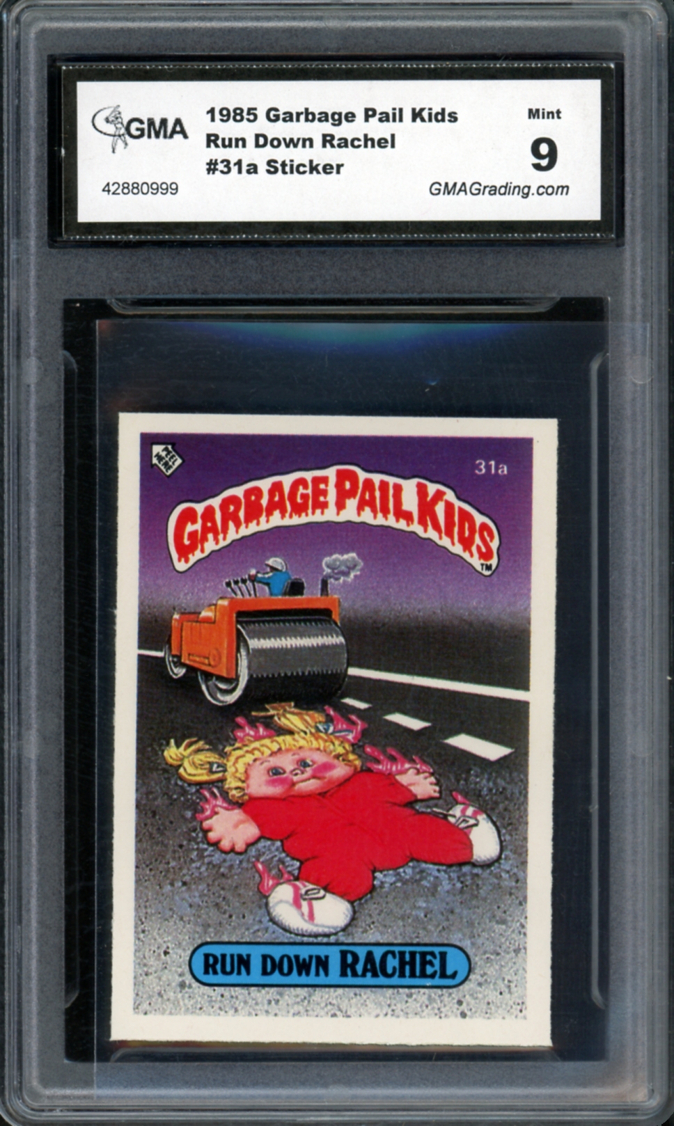 1985 Topps Garbage Pail Kids UK Series 1 #31a Run Down Rachel Sticker GMA Graded 9 Mint Non-Sport Trading Card
