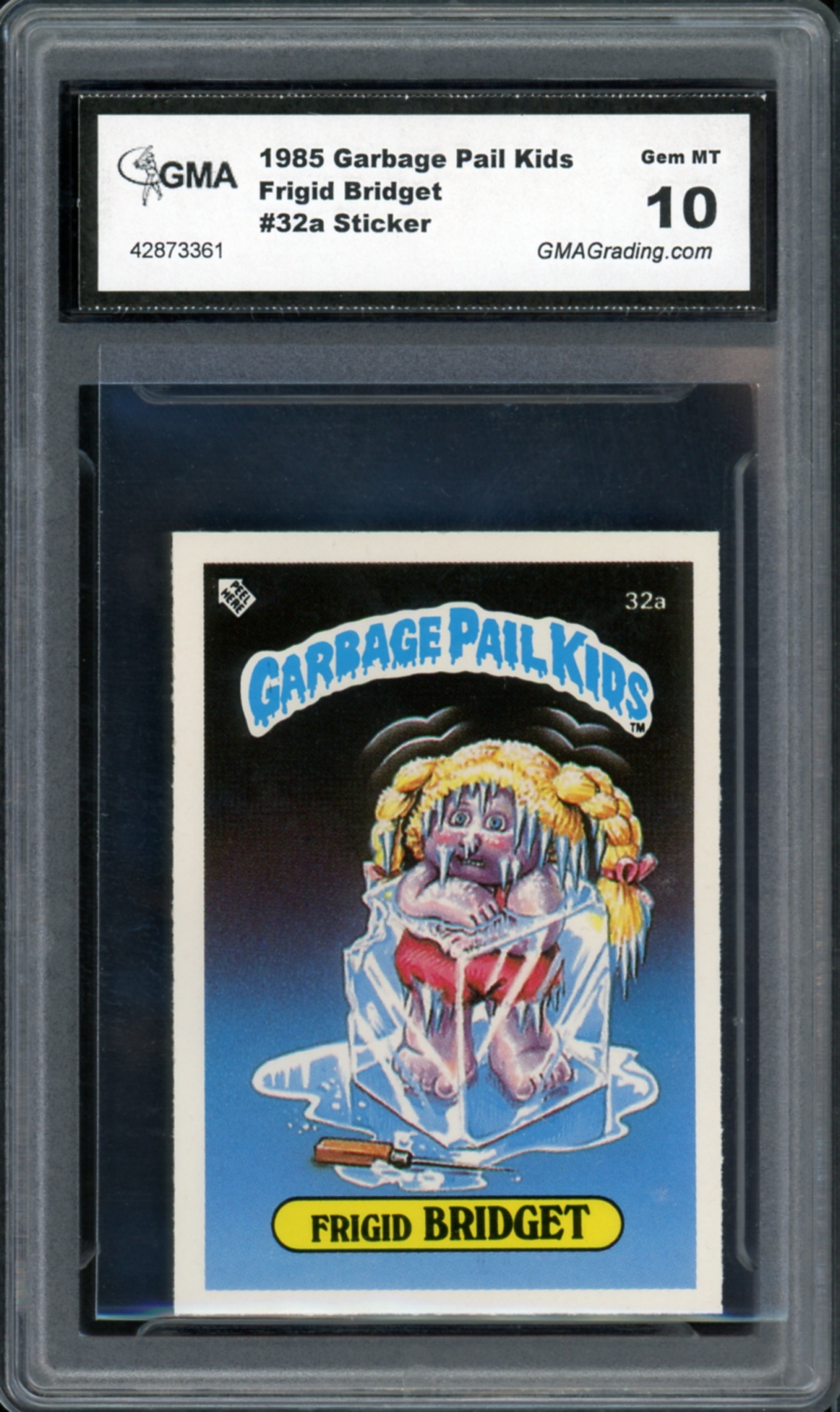 1985 Topps Garbage Pail Kids UK Series 1 #32a Frigid Bridget Sticker GMA Graded 10 Gem Mint Non-Sport Trading Card