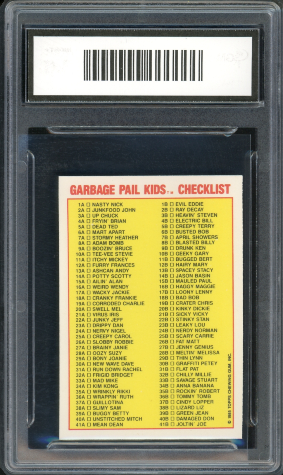 1985 Topps Garbage Pail Kids UK Series 1 #5b Creepy Terry Checklist Sticker GMA Graded 10 Gem Mint Non-Sport Trading Card