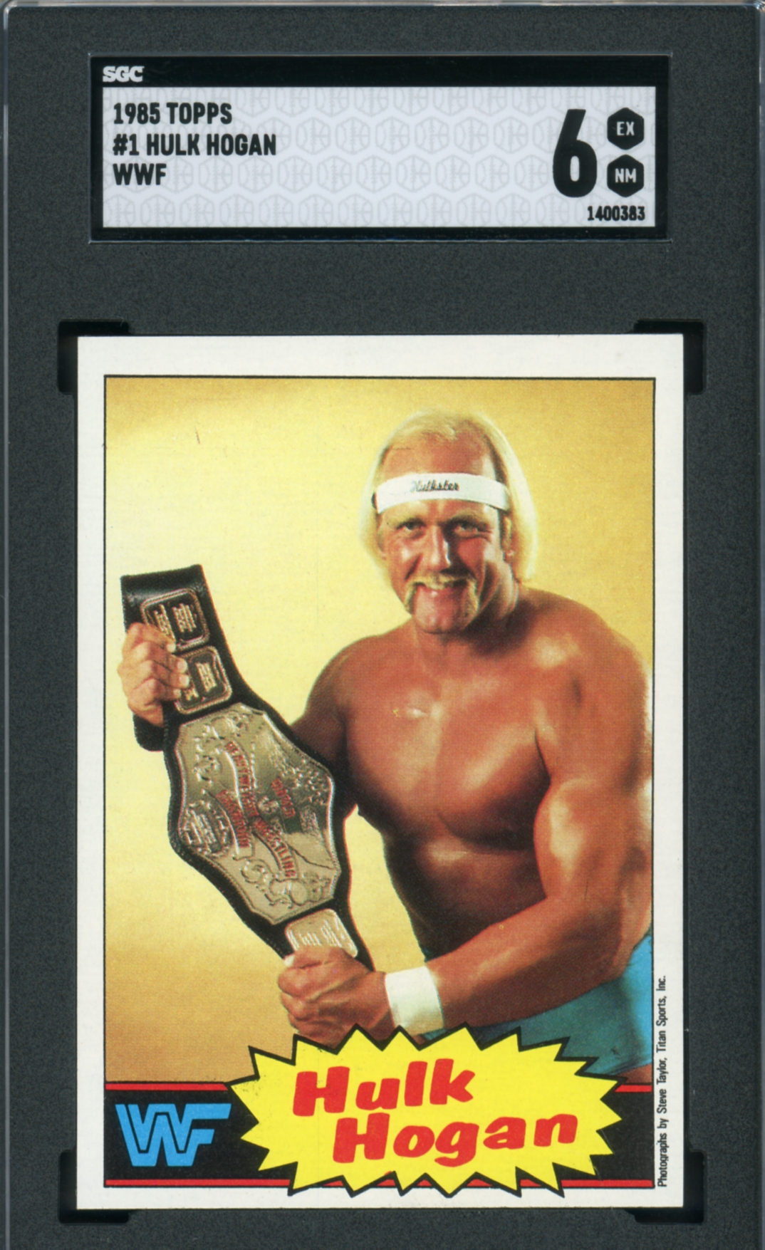 1985 Topps WWF Pro Wrestling Stars Trading Card #1 Hulk Hogan SGC Graded 6 EX-NM – This card has been professionally graded & authenticated by Sportscard Guaranty Corporation (SGC).