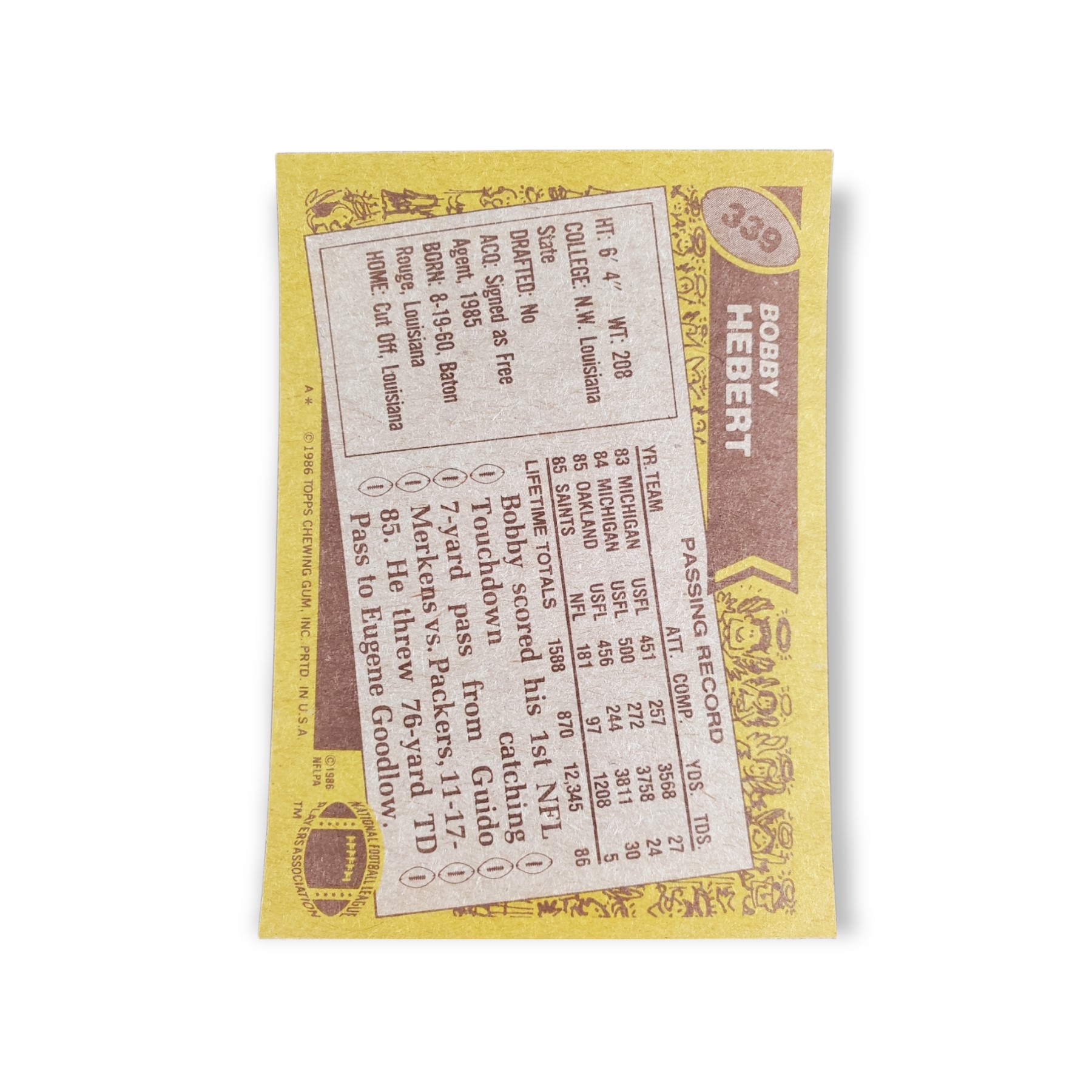 1986 Topps Football Bobby Hebert Rookie Card #339 New Orleans Saints Trading Card