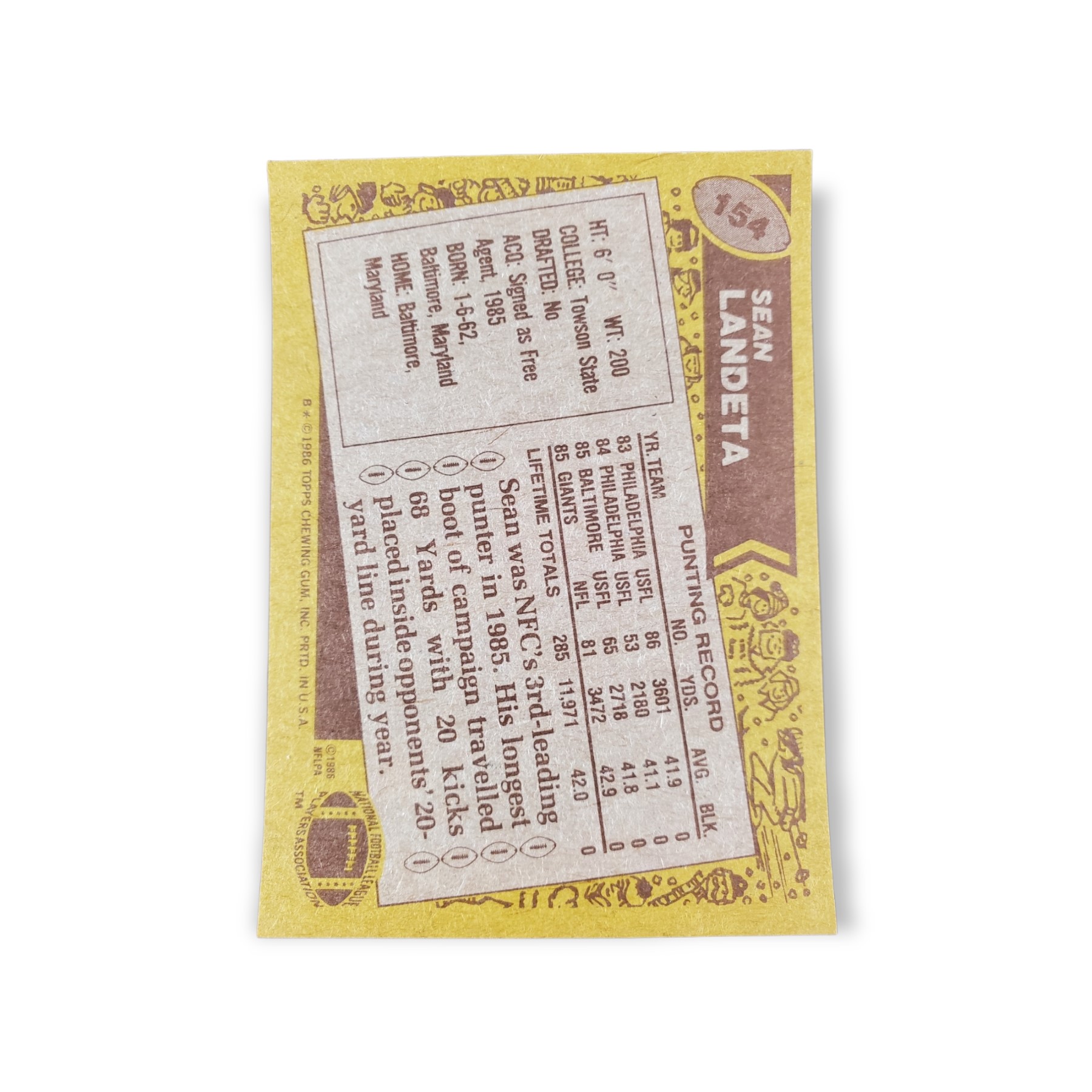 1986 Topps Football Sean Landeta Card #154 New York Giants Trading Card