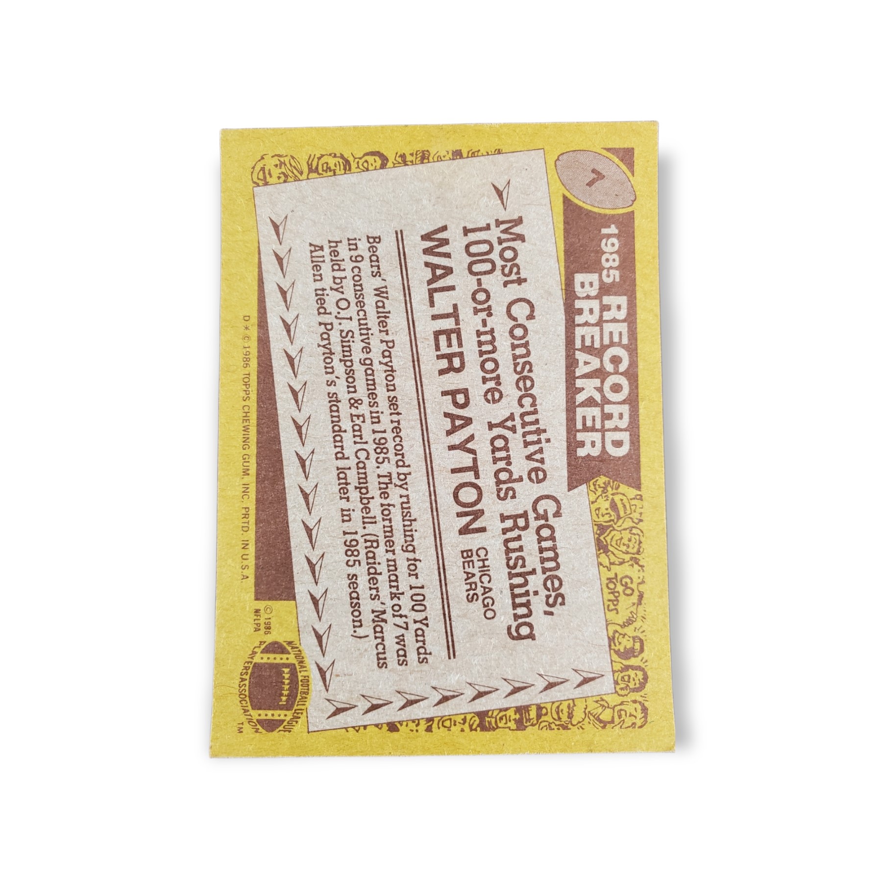 1986 Topps Football Walter Payton Card #7 Record Breaker Chicago Bears Trading Card