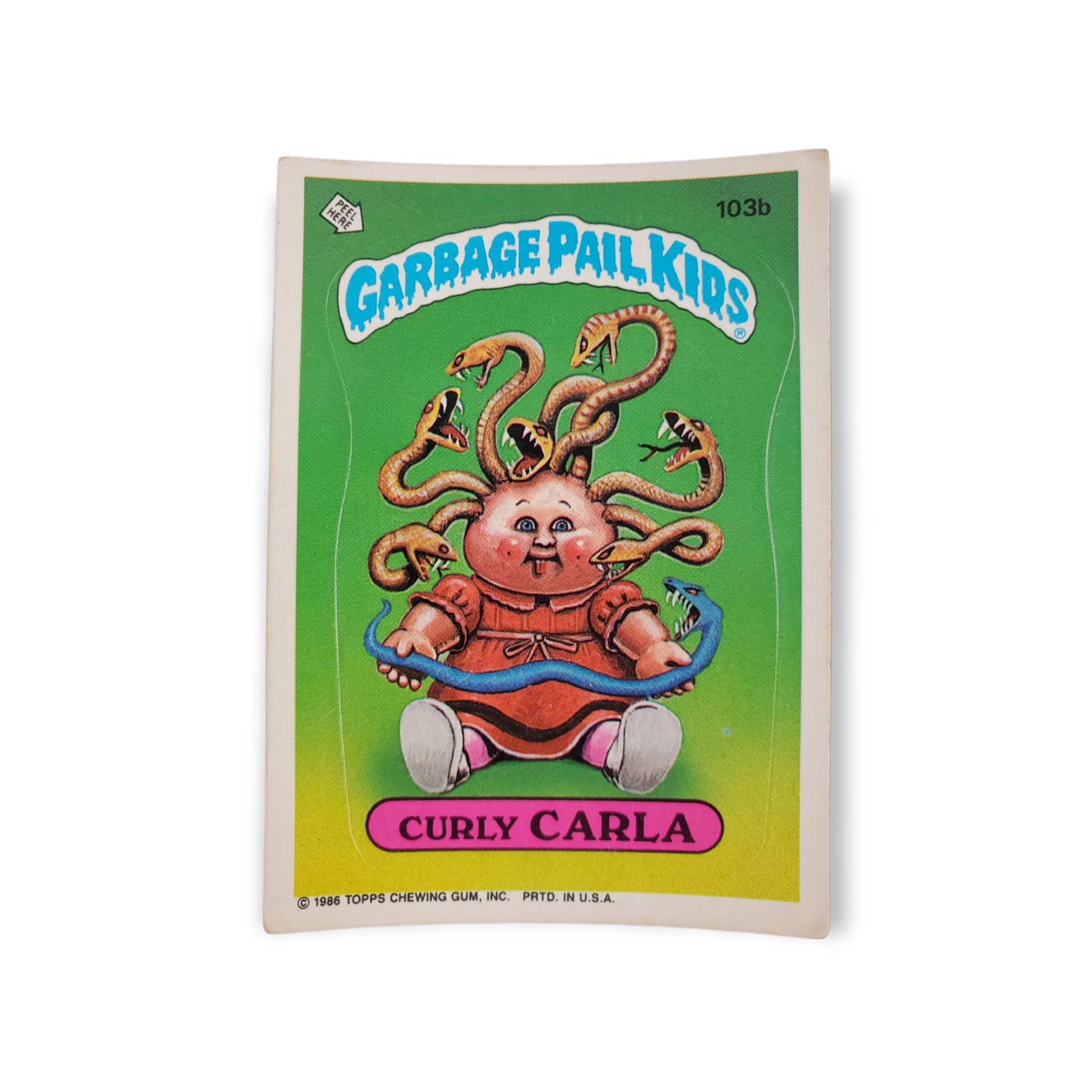 1986 Topps Garbage Pail Kids Original Series 3 Trading Card #103b Curly Carla Sticker – Variation: Copyright on card front. The cards condition should be considered lightly to moderately used or handled. The card may have any of the following: little to no creasing, light scratches, slight off coloring, lightly worn corners, off centering, or otherwise noted imperfections so please carefully review all available images.