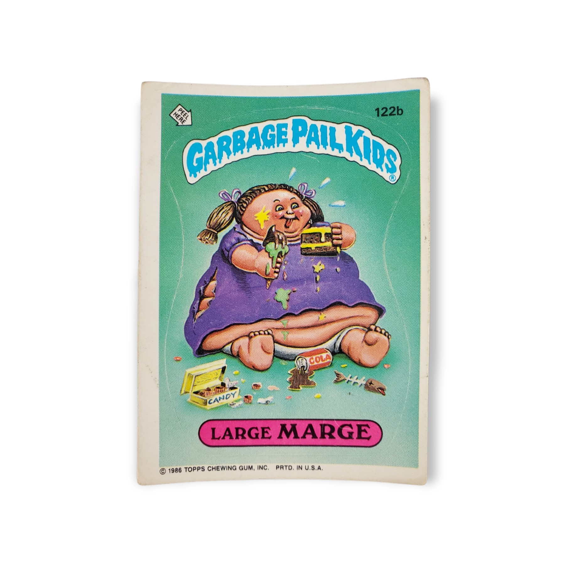 1986 Topps Garbage Pail Kids Original Series 3 Trading Card #122b Large Marge Sticker – Variation: Copyright on card front. The cards condition should be considered heavily used or handled. The card may have any of the following: heavy creases, stains, scratches, spots where the original paper has peeled, rounded corners, off centering, writing, a miscut, misprint, or otherwise noted imperfection so please carefully review all available images.