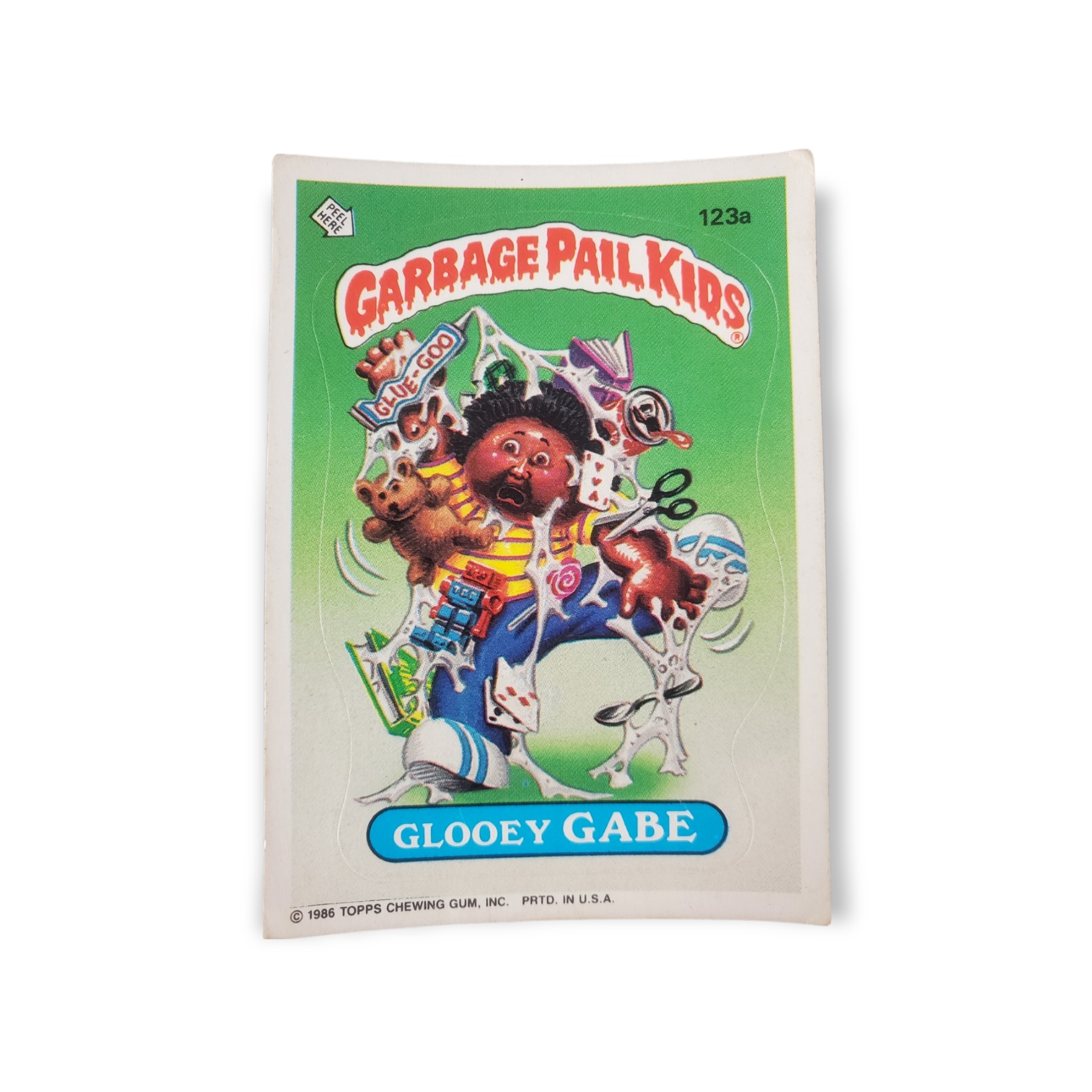 1986 Topps Garbage Pail Kids Original Series 3 Trading Card #123a Glooey Gabe Sticker – Variation: Copyright on card front. The cards condition should be considered lightly to moderately used or handled. The card may have any of the following: little to no creasing, light scratches, slight off coloring, lightly worn corners, off centering, or otherwise noted imperfections so please carefully review all available images.