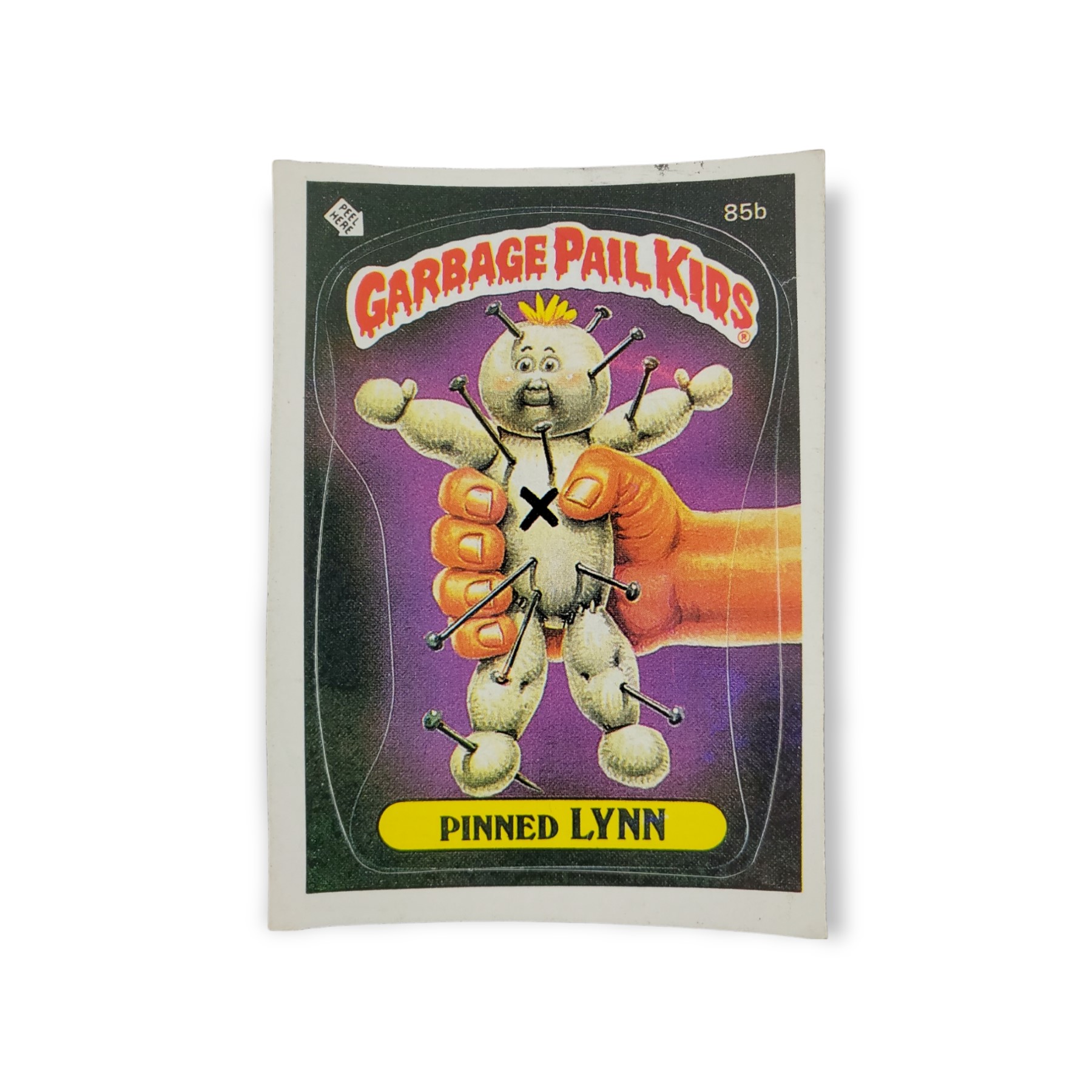 1986 Topps Garbage Pail Kids Original Series 3 Trading Card #85b Pinned Lynn Sticker – Variation: No copyright; Error: Double Die Cut. The cards condition should be considered moderately to heavily used or handled. The card may have any of the following: minor creases, stains, scratches, rounded corners, off centering, a miscut, misprint, or otherwise noted imperfection so please carefully review all available images.