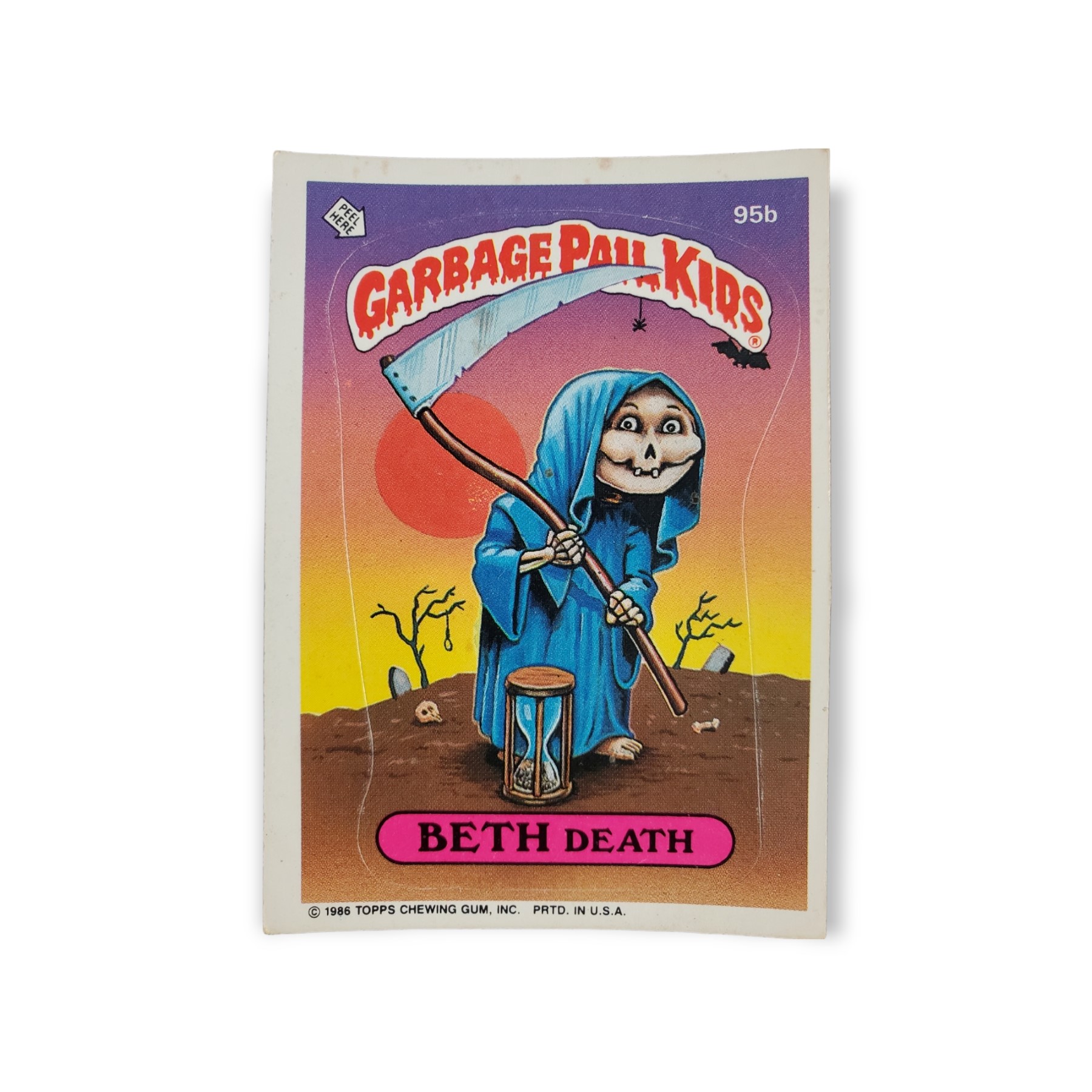 1986 Topps Garbage Pail Kids Original Series 3 Trading Card #95b Beth Death Sticker – Variation: Copyright on card front. The cards condition should be considered lightly to moderately used or handled. The card may have any of the following: little to no creasing, light scratches, slight off coloring, lightly worn corners, off centering, or otherwise noted imperfections so please carefully review all available images.