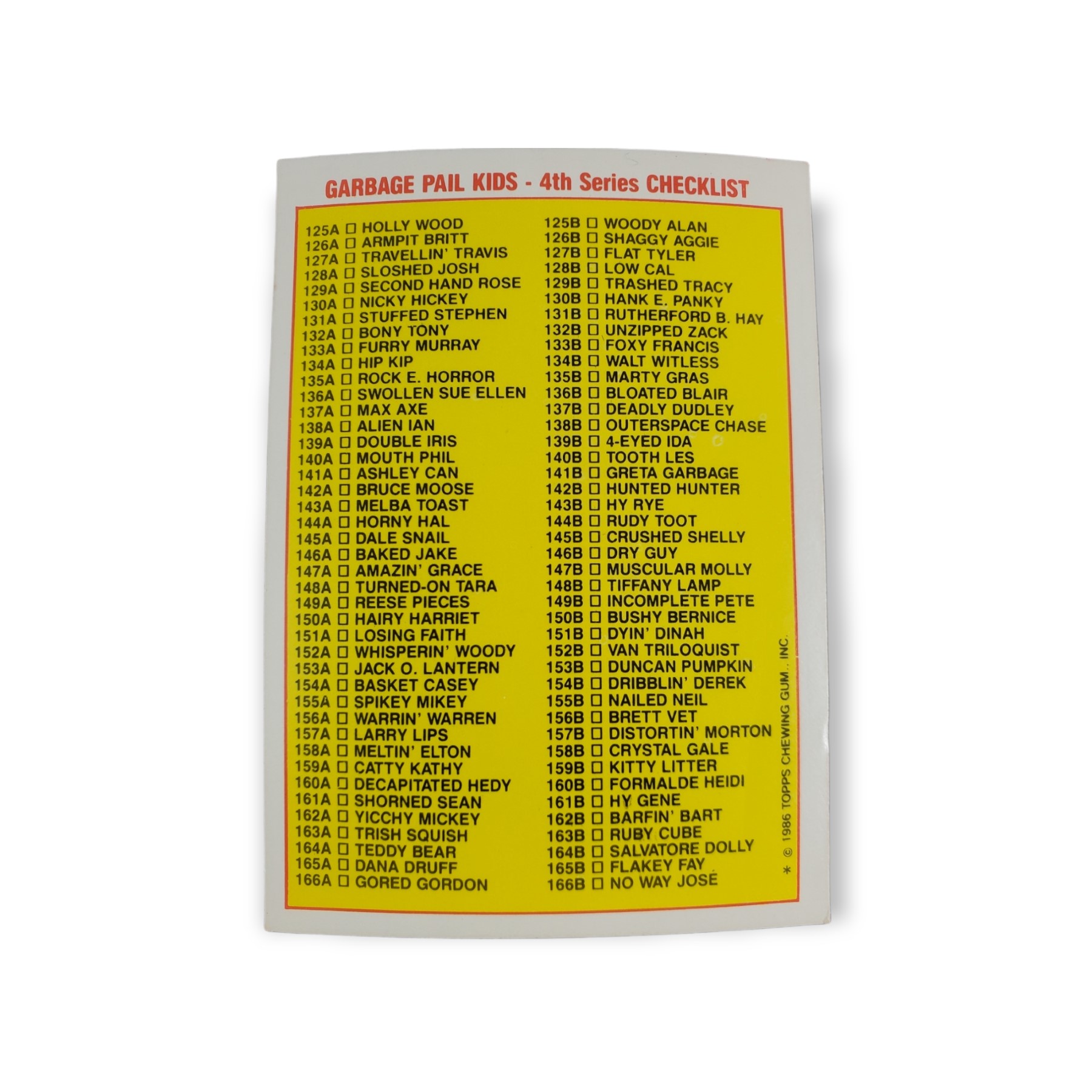 1986 Topps Garbage Pail Kids Original Series 4 Trading Card #125a Holly Wood Checklist Sticker – Variation: Card 125B listed as “Woody Alan”, one * on copyright line. The cards condition should be considered lightly to moderately used or handled. The card may have any of the following: little to no creasing, light scratches, slight off coloring, lightly worn corners, off centering, or otherwise noted imperfections so please carefully review all available images.
