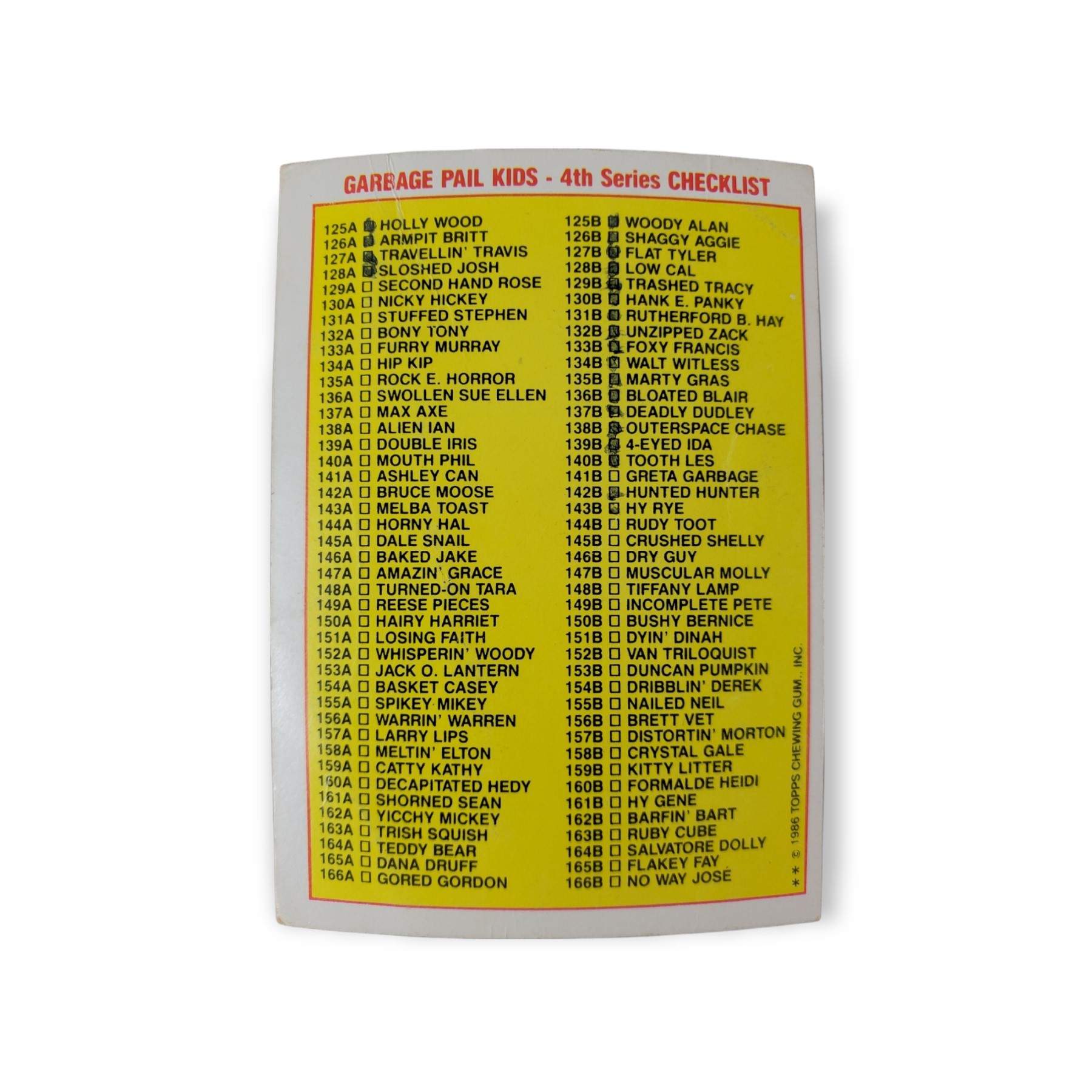 1986 Topps Garbage Pail Kids Original Series 4 Trading Card #138b Outerspace Chase Checklist Sticker – Variation: Card 125B listed as “Woody Alan”, Two ** on copyright line. The checklist back has been written on and marked. The cards condition should be considered heavily used or handled. The card may have any of the following: heavy creases, stains, scratches, spots where the original paper has peeled, rounded corners, off centering, writing, a miscut, misprint, or otherwise noted imperfection so please carefully review all available images.