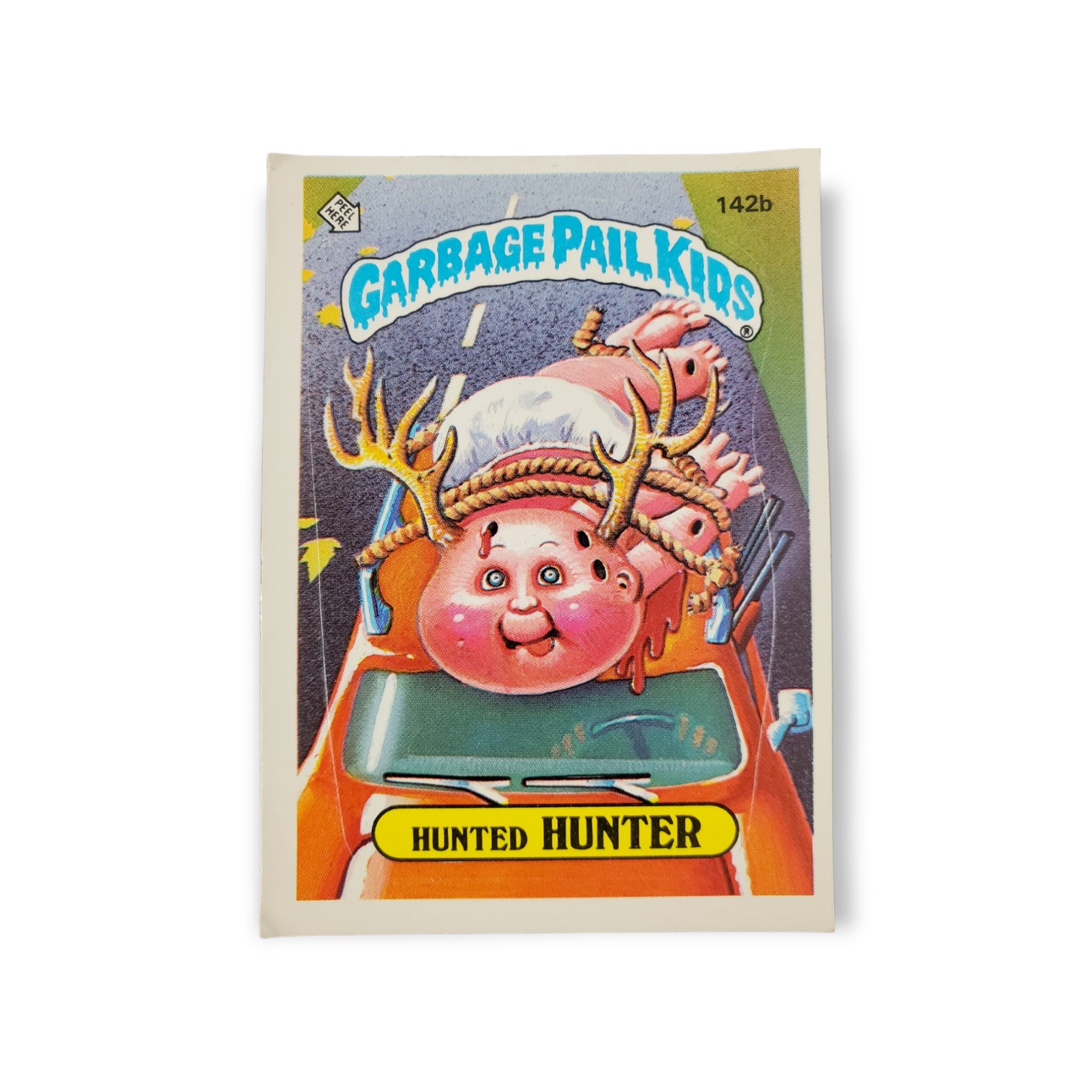 1986 Topps Garbage Pail Kids Original Series 4 Trading Card #142b Hunted Hunter Sticker – Corrected Error: Die cut is correct (does not cut through antlers or hand); Variation: Two ** on copyright line. The cards condition should be considered moderately to heavily used or handled. The card may have any of the following: minor creases, stains, scratches, rounded corners, off centering, a miscut, misprint, or otherwise noted imperfection so please carefully review all available images.