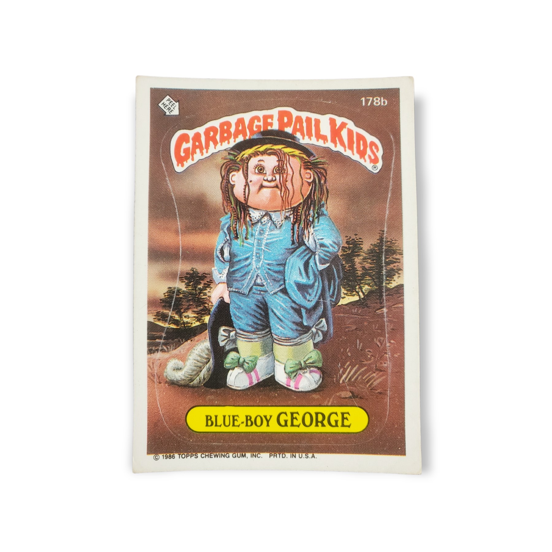 1986 Topps Garbage Pail Kids Original Series 5 Trading Card #178b Blue-Boy George Sticker – Variation: Back is Purple Puzzle, Row 4 Right. The cards condition should be considered lightly to moderately used or handled. The card may have any of the following: little to no creasing, light scratches, slight off coloring, lightly worn corners, off centering, or otherwise noted imperfections so please carefully review all available images.