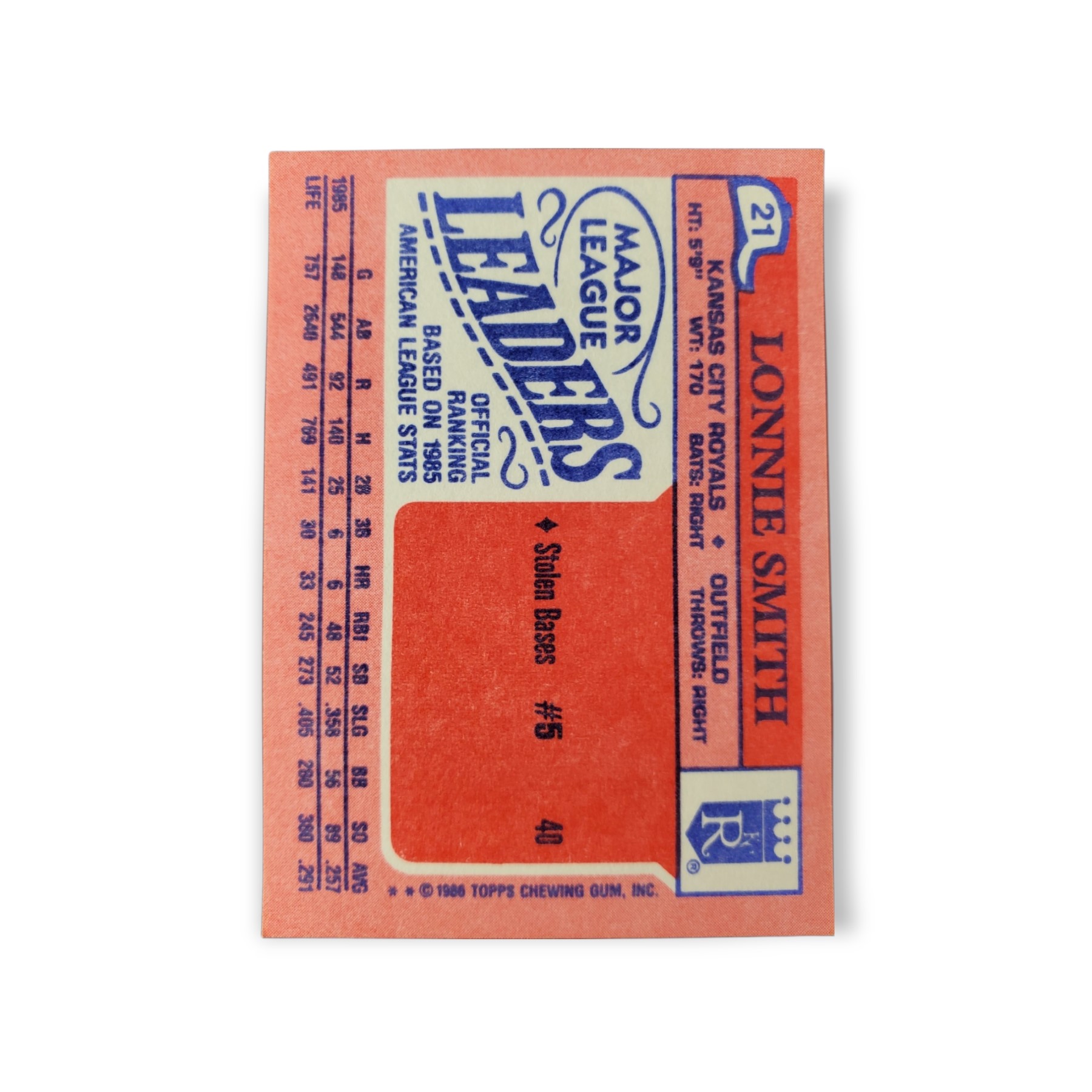 1986 Topps Mini Major League Leaders #21 Lonnie Smith Kansas City Royals Baseball Trading Card – The 1986 Topps Mini Major League Leaders baseball card set consists of 66 cards total, with each card measuring 2 1/8″ x 3″. The front of the card shows a picture of Lonnie Smith while the back of the card has his statistics from the previous year as well as his career stats and player profile.