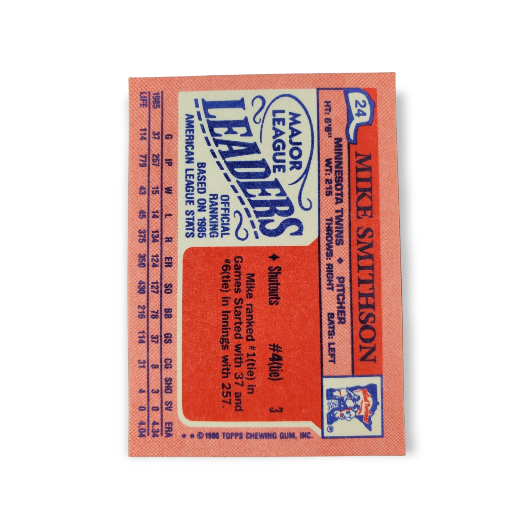 1986 Topps Mini Major League Leaders #24 Mike Smithson Minnesota Twins Baseball Trading Card – The 1986 Topps Mini Major League Leaders baseball card set consists of 66 cards total, with each card measuring 2 1/8″ x 3″. The front of the card shows a picture of Mike Smithson while the back of the card has his statistics from the previous year as well as his career stats and player profile.