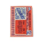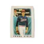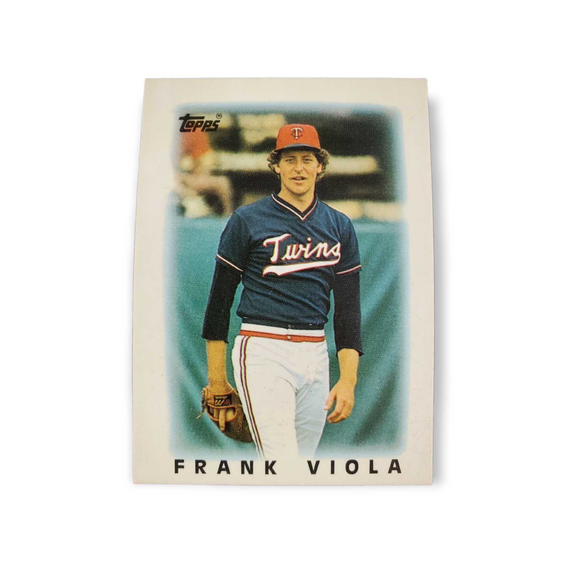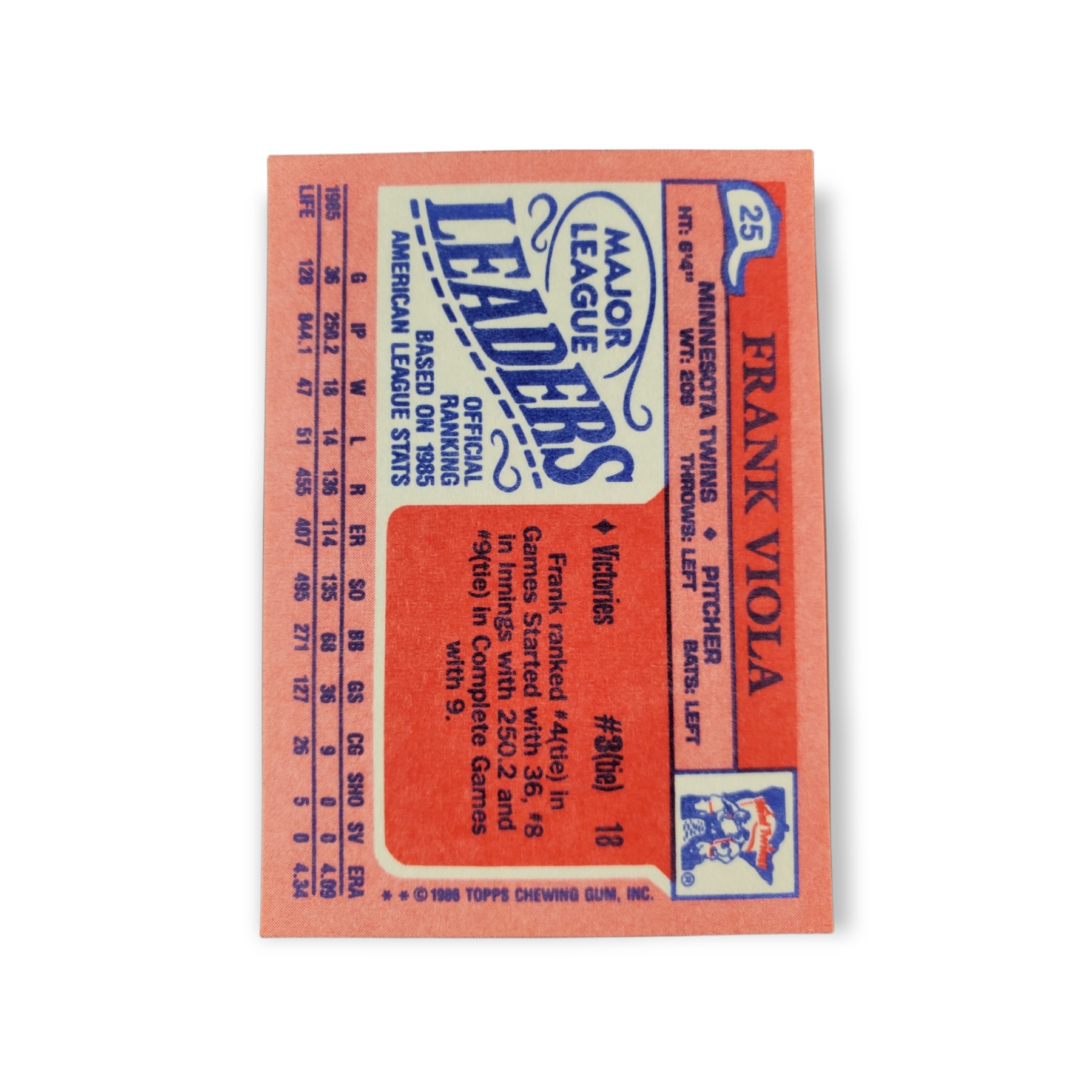 1986 Topps Mini Major League Leaders #25 Frank Viola Minnesota Twins Baseball Trading Card – The 1986 Topps Mini Major League Leaders baseball card set consists of 66 cards total, with each card measuring 2 1/8″ x 3″. The front of the card shows a picture of Frank Viola while the back of the card has his statistics from the previous year as well as his career stats and player profile.