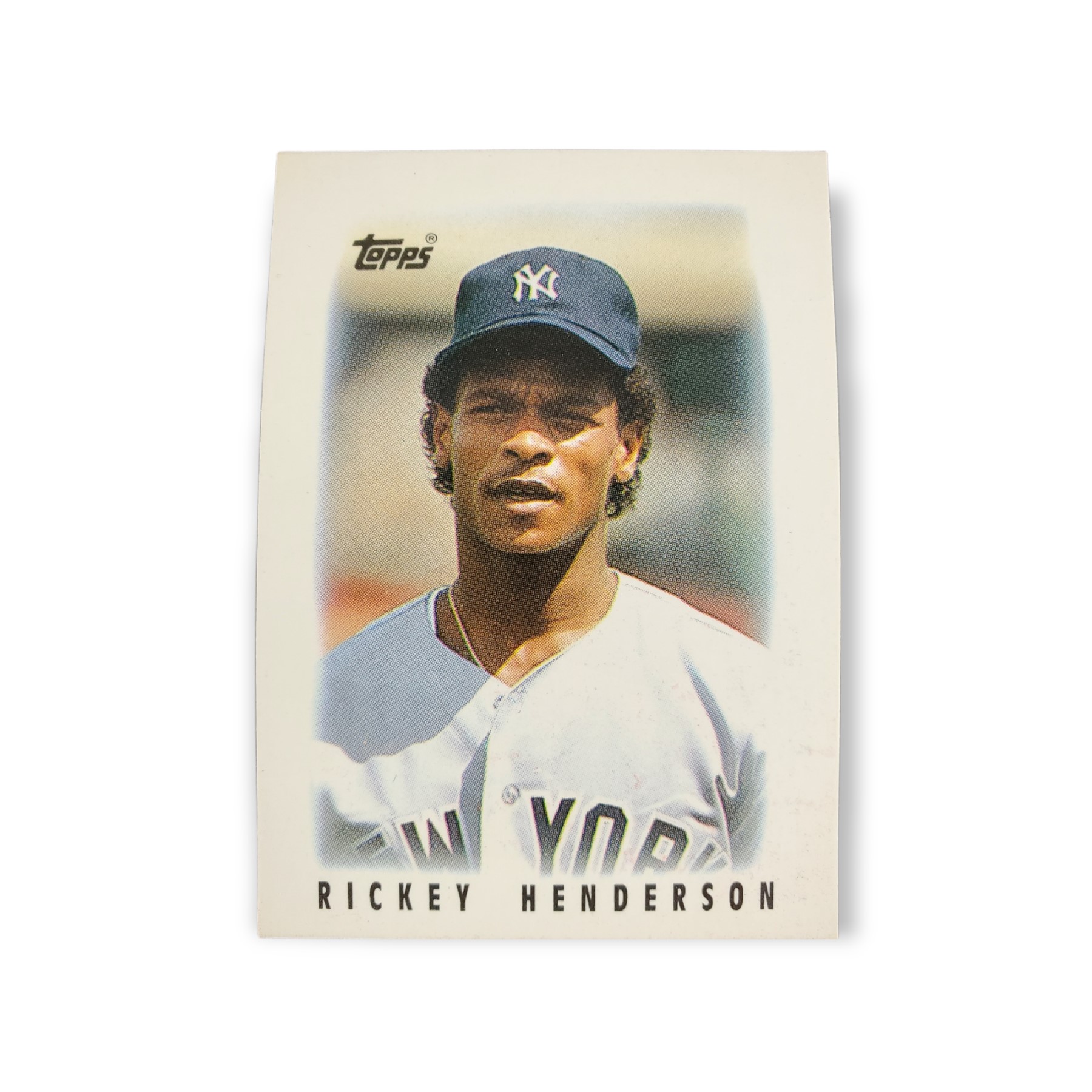 1986 Topps Mini Major League Leaders #27 Rickey Henderson New York Yankees Baseball Trading Card – The 1986 Topps Mini Major League Leaders baseball card set consists of 66 cards total, with each card measuring 2 1/8″ x 3″. The front of the card shows a picture of Rickey Henderson while the back of the card has his statistics from the previous year as well as his career stats and player profile.