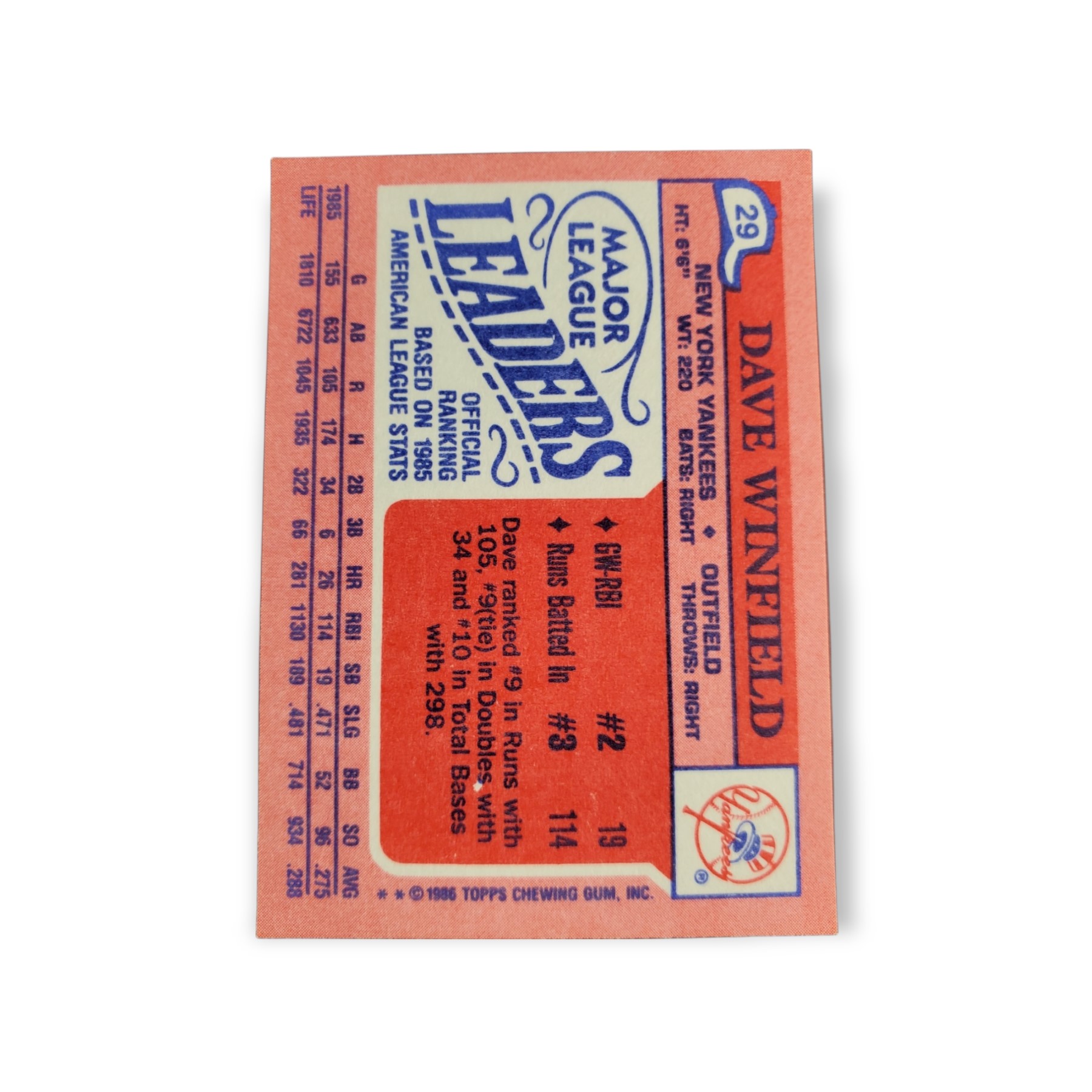 1986 Topps Mini Major League Leaders #29 Dave Winfield New York Yankees Baseball Trading Card – The 1986 Topps Mini Major League Leaders baseball card set consists of 66 cards total, with each card measuring 2 1/8″ x 3″. The front of the card shows a picture of Dave Winfield while the back of the card has his statistics from the previous year as well as his career stats and player profile.