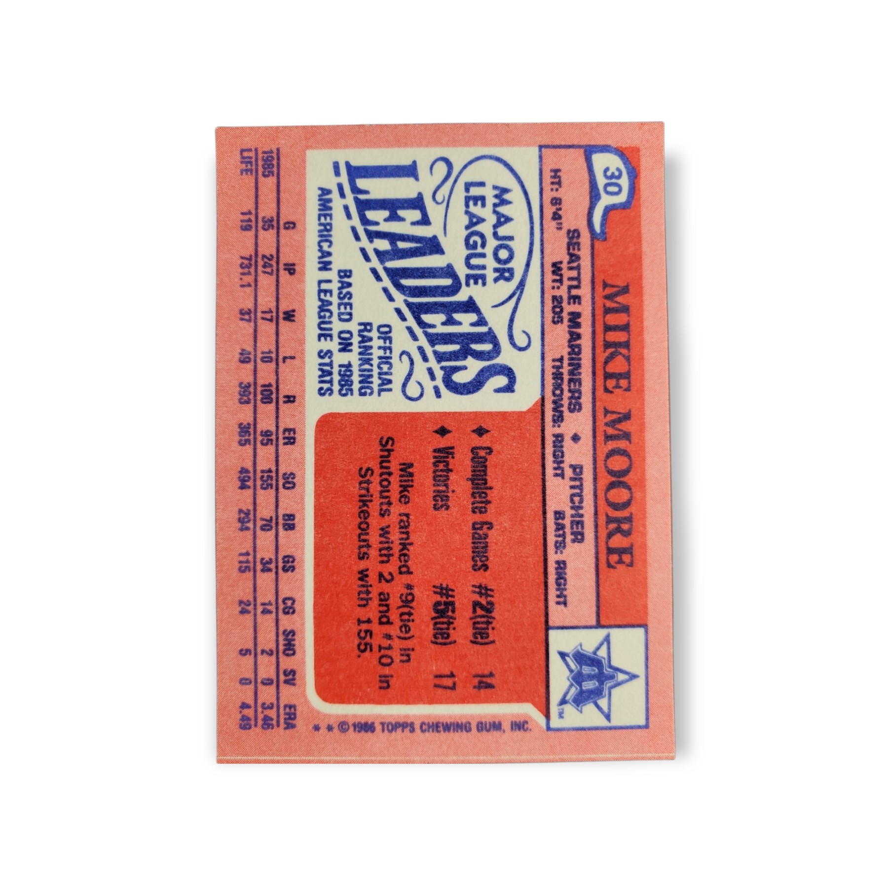 1986 Topps Mini Major League Leaders #30 Mike Moore Seattle Mariners Baseball Trading Card – The 1986 Topps Mini Major League Leaders baseball card set consists of 66 cards total, with each card measuring 2 1/8″ x 3″. The front of the card shows a picture of Mike Moore while the back of the card has his statistics from the previous year as well as his career stats and player profile.