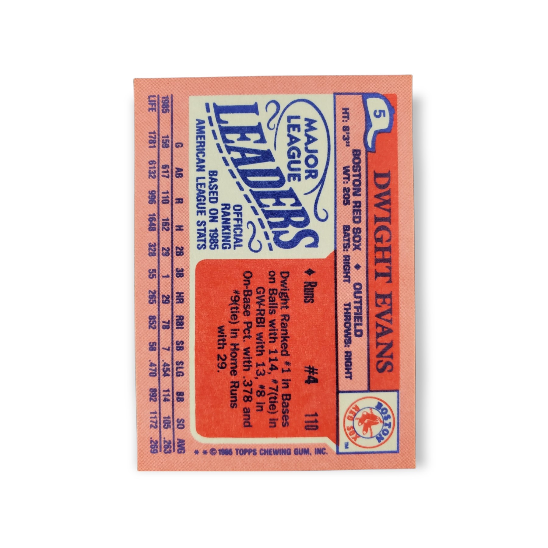 1986 Topps Mini Major League Leaders #5 Dwight Evans Boston Red Sox Baseball Trading Card – The 1986 Topps Mini Major League Leaders baseball card set consists of 66 cards total, with each card measuring 2 1/8″ x 3″. The front of the card shows a picture of Dwight Evans while the back of the card has his statistics from the previous year as well as his career stats and player profile.
