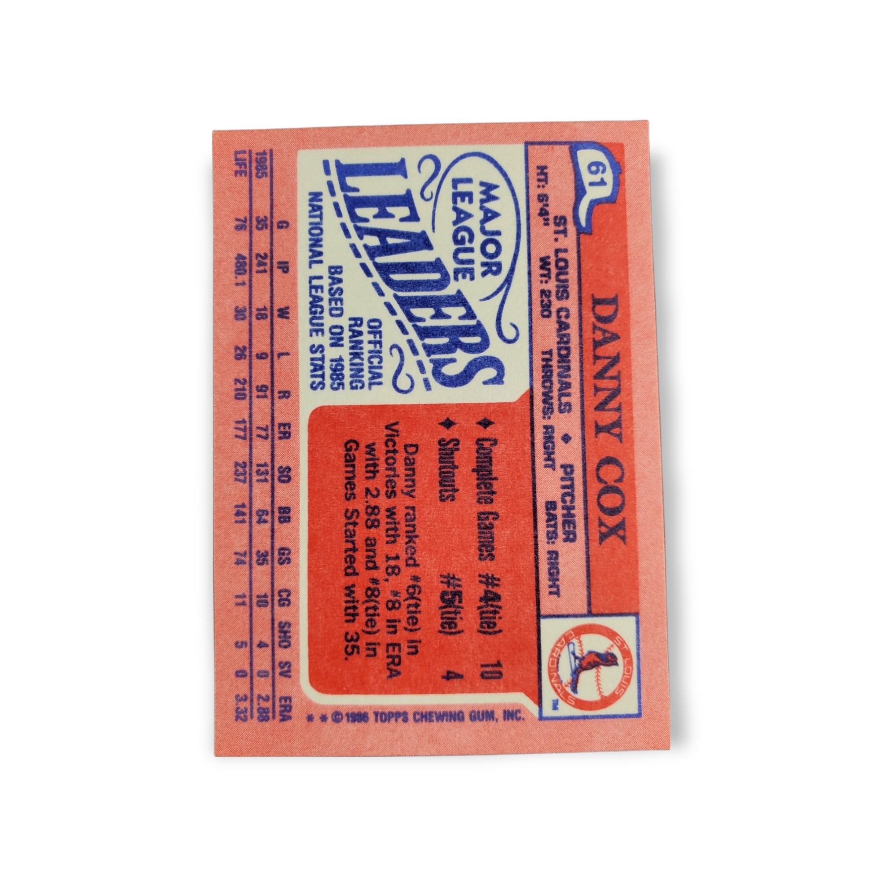 1986 Topps Mini Major League Leaders #61 Danny Cox St. Louis Cardinals Baseball Trading Card – The 1986 Topps Mini Major League Leaders baseball card set consists of 66 cards total, with each card measuring 2 1/8″ x 3″. The front of the card shows a picture of Danny Cox while the back of the card has his statistics from the previous year as well as his career stats and player profile.