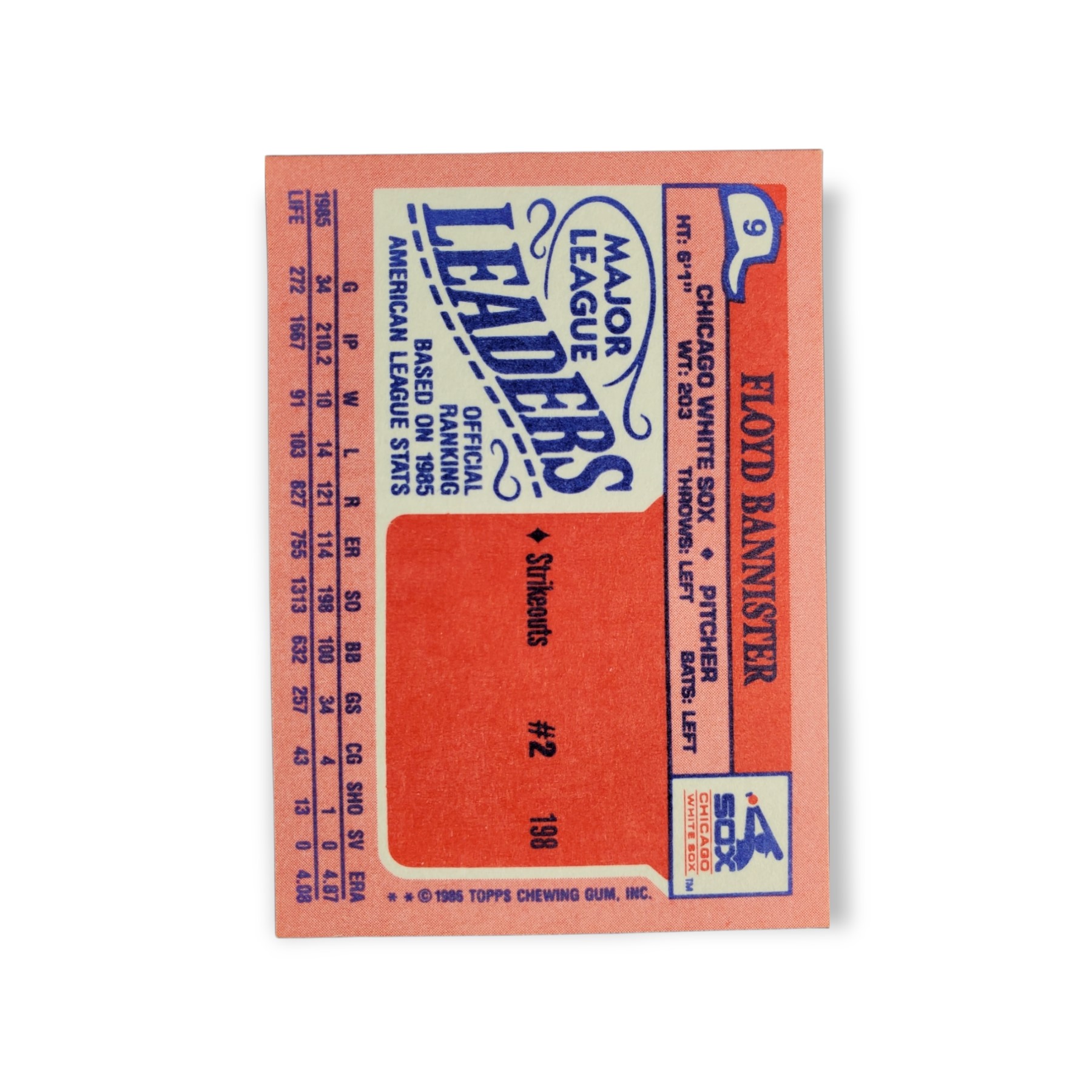 1986 Topps Mini Major League Leaders #9 Floyd Bannister Chicago White Sox Baseball Trading Card – The 1986 Topps Mini Major League Leaders baseball card set consists of 66 cards total, with each card measuring 2 1/8″ x 3″. The front of the card shows a picture of Floyd Bannister while the back of the card has his statistics from the previous year as well as his career stats and player profile.