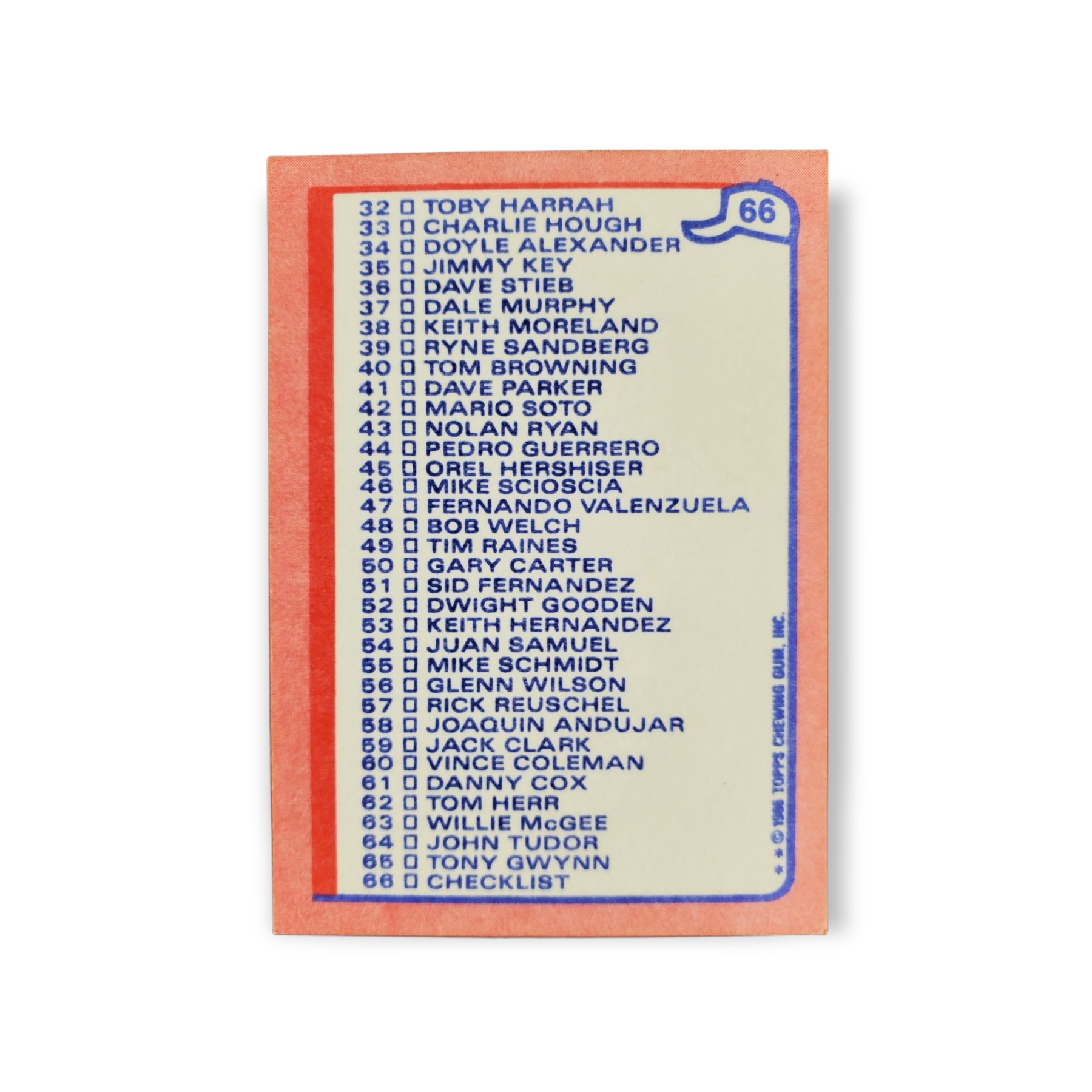 1986 Topps Mini Major League Leaders Checklist #66 Baseball Trading Card – The 1986 Topps Mini Major League Leaders baseball card set consists of 66 cards total, with each card measuring 2 1/8″ x 3″. The front and back of the checklist show a complete list of all the cards in the 1986 Topps Mini Major League Leaders baseball card set.