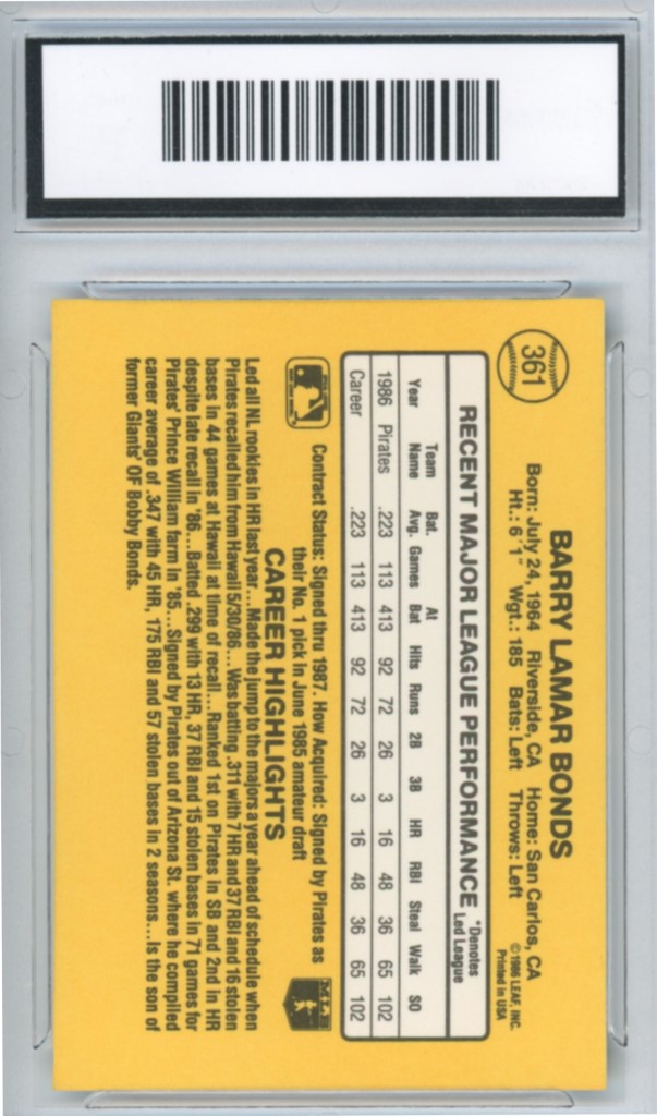 1987 Donruss Barry Bonds Rookie Pittsburgh Pirates Baseball Card #361 – GMA Professional Graded 8 NM-MT