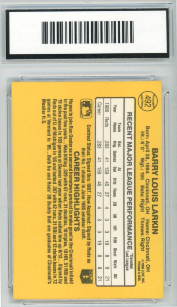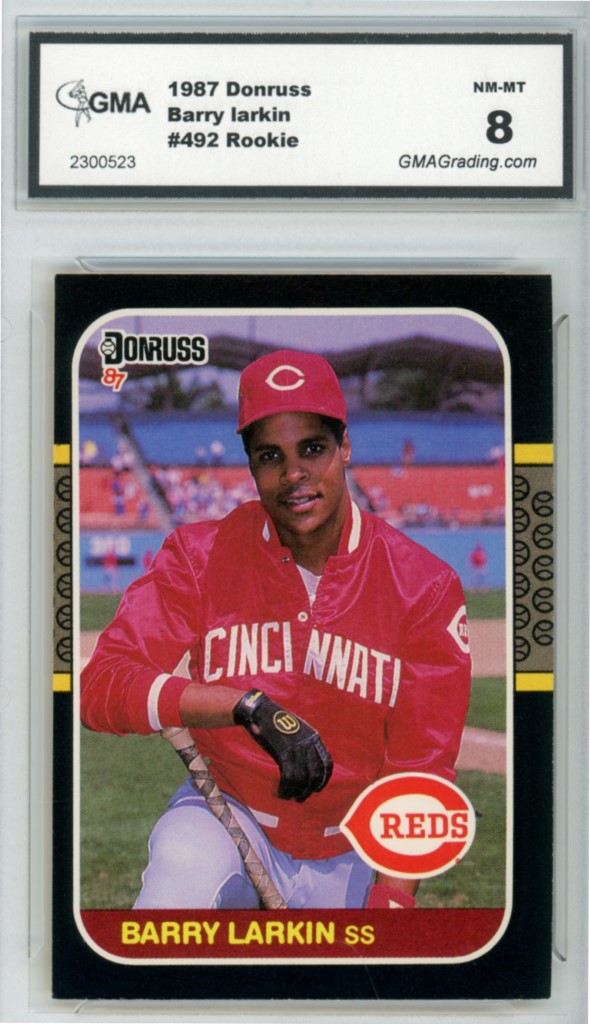 1987 Donruss Barry Larkin Rookie Cincinnati Reds Baseball Card #492 – GMA Professional Graded 8 NM-MT