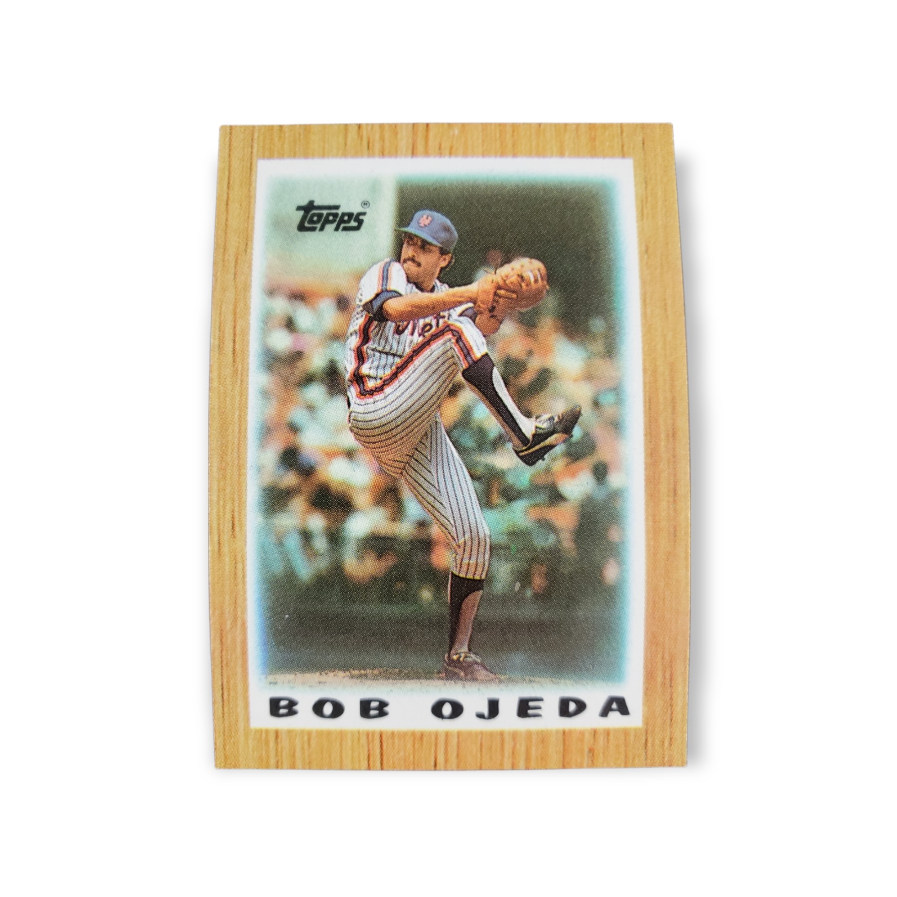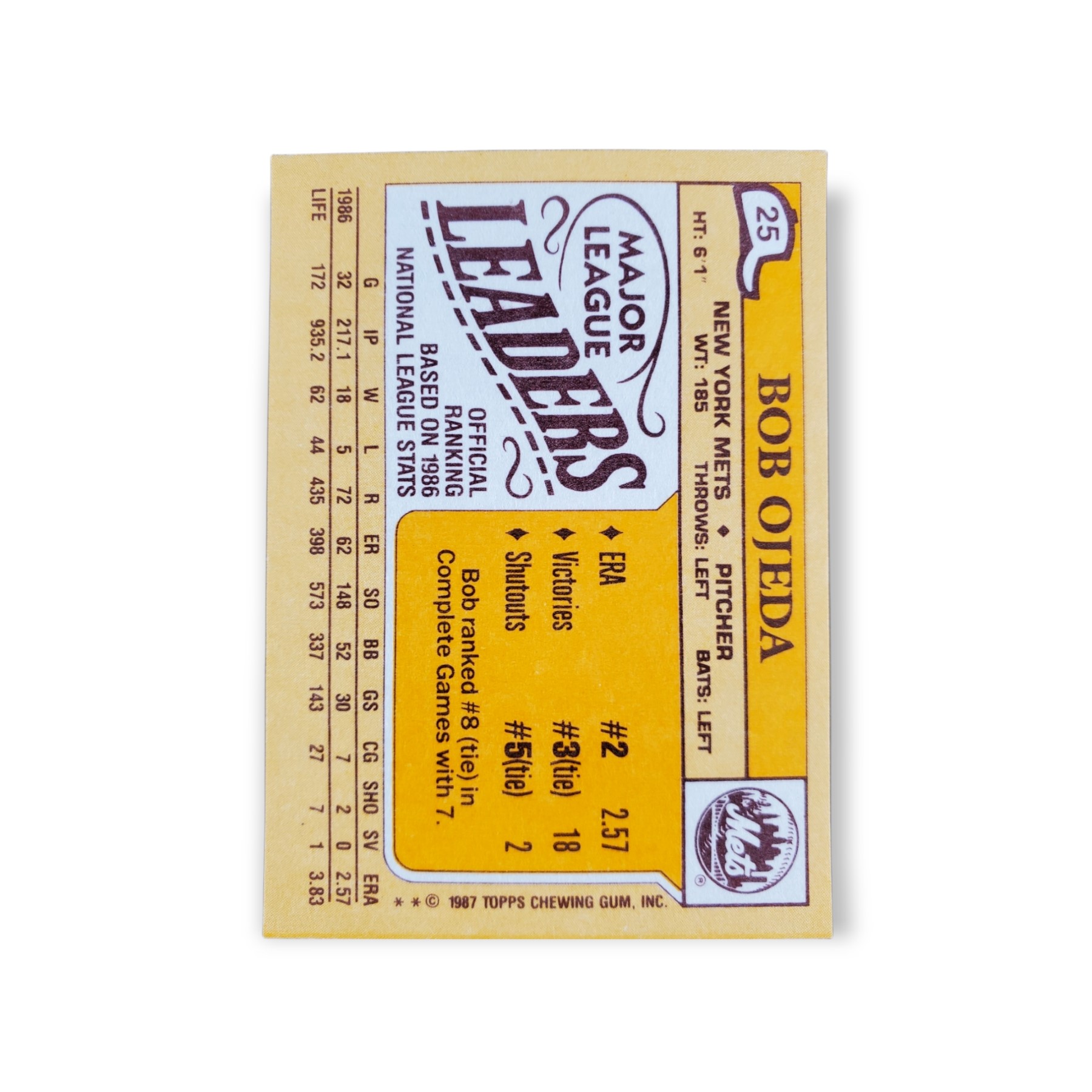 1987 Topps Mini Major League Leaders #25 Bob Ojeda New York Mets Baseball Trading Card – The 1987 Topps Mini Major League Leaders baseball card set consists of 77 cards total, with each card measuring 2 1/8″ x 3″. The front of the card shows a picture of Bob Ojeda while the back of the card has his statistics from the previous year as well as his career stats and player profile.