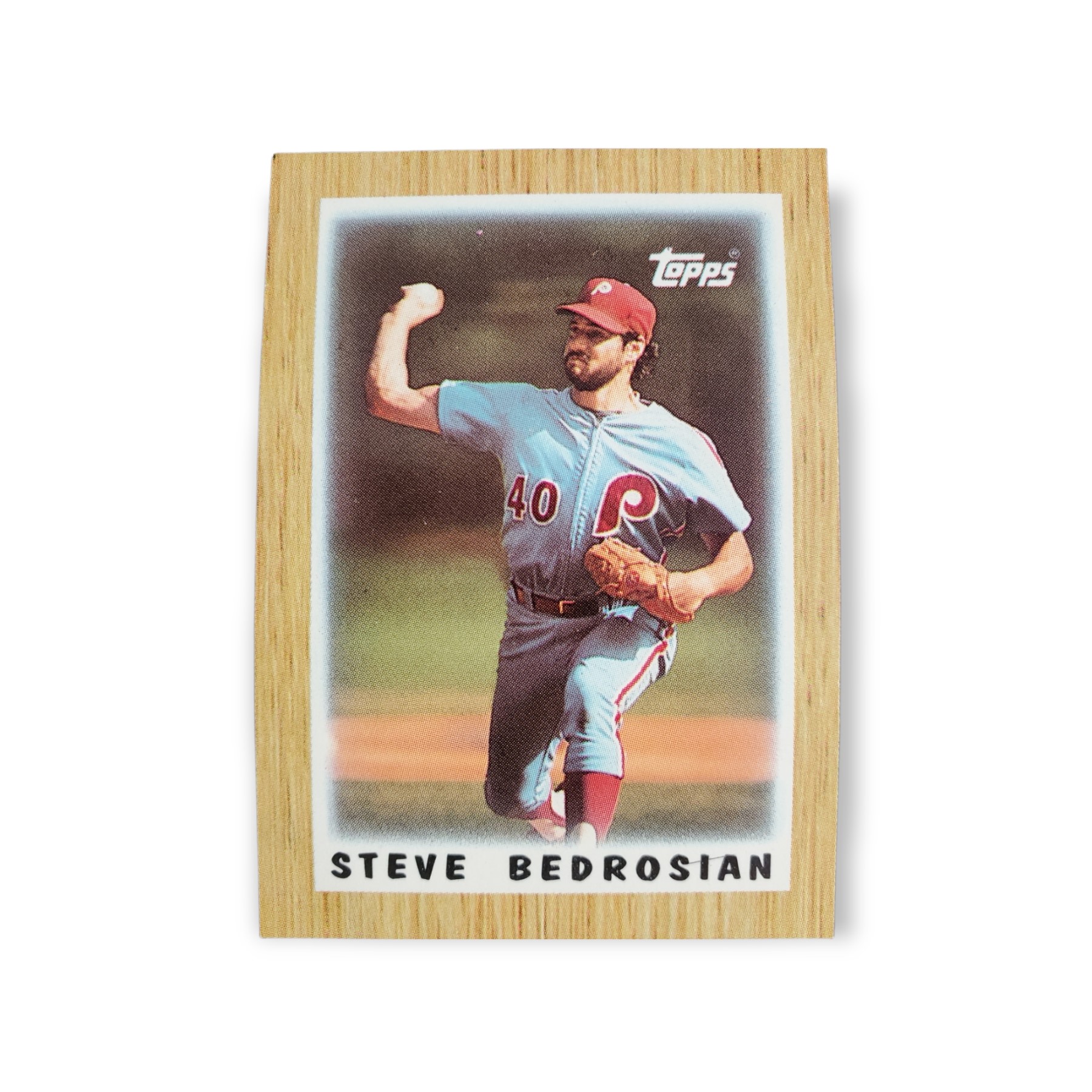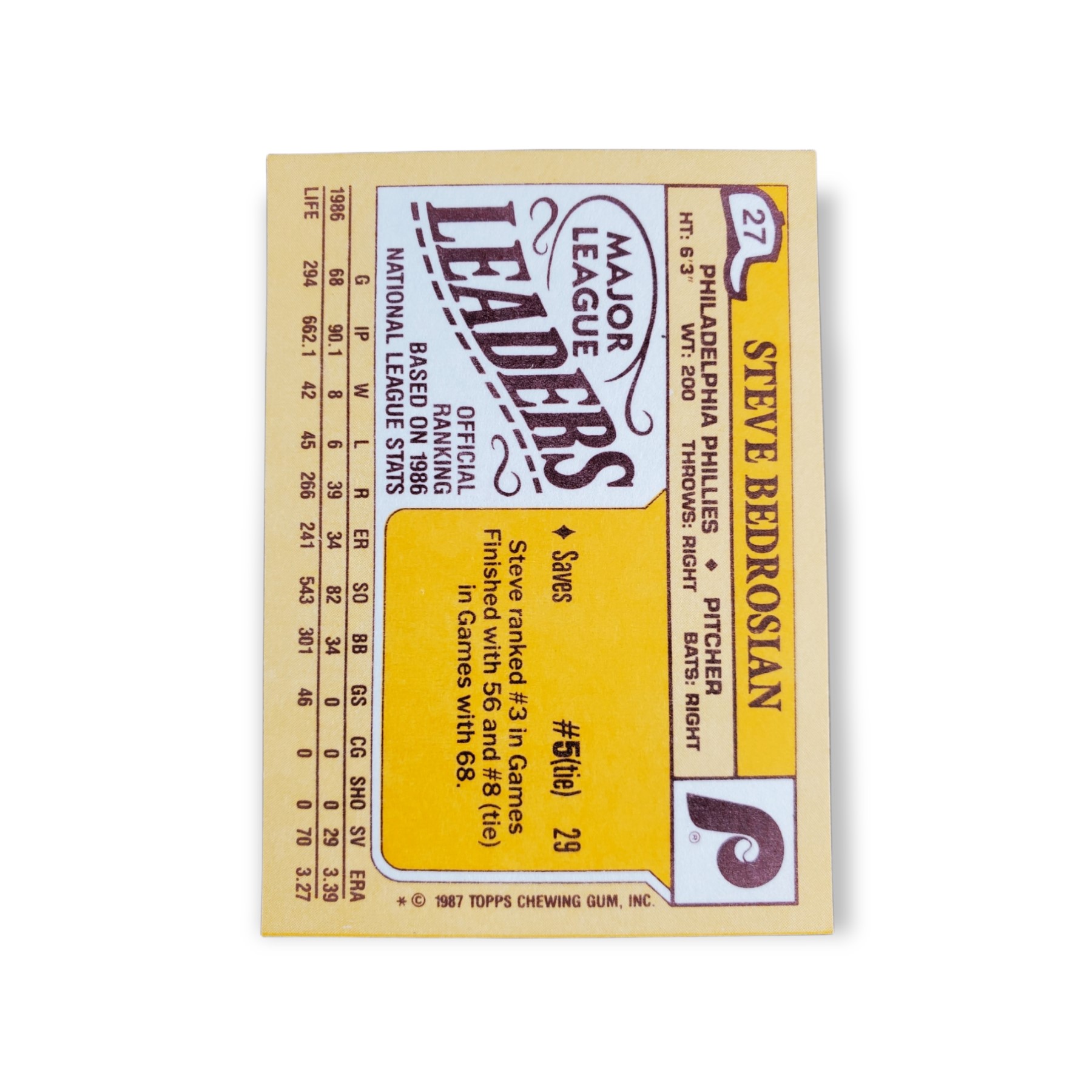 1987 Topps Mini Major League Leaders #27 Steve Bedrosian Philadelphia Phillies Baseball Trading Card – The 1987 Topps Mini Major League Leaders baseball card set consists of 77 cards total, with each card measuring 2 1/8″ x 3″. The front of the card shows a picture of Steve Bedrosian while the back of the card has his statistics from the previous year as well as his career stats and player profile.