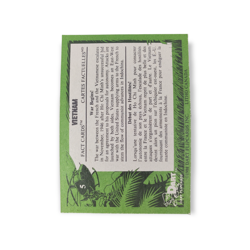 1988 Dart Flipcards Vietnam Fact Cards Trading Card #5 War Begins! – This card was manufactured in Canada.