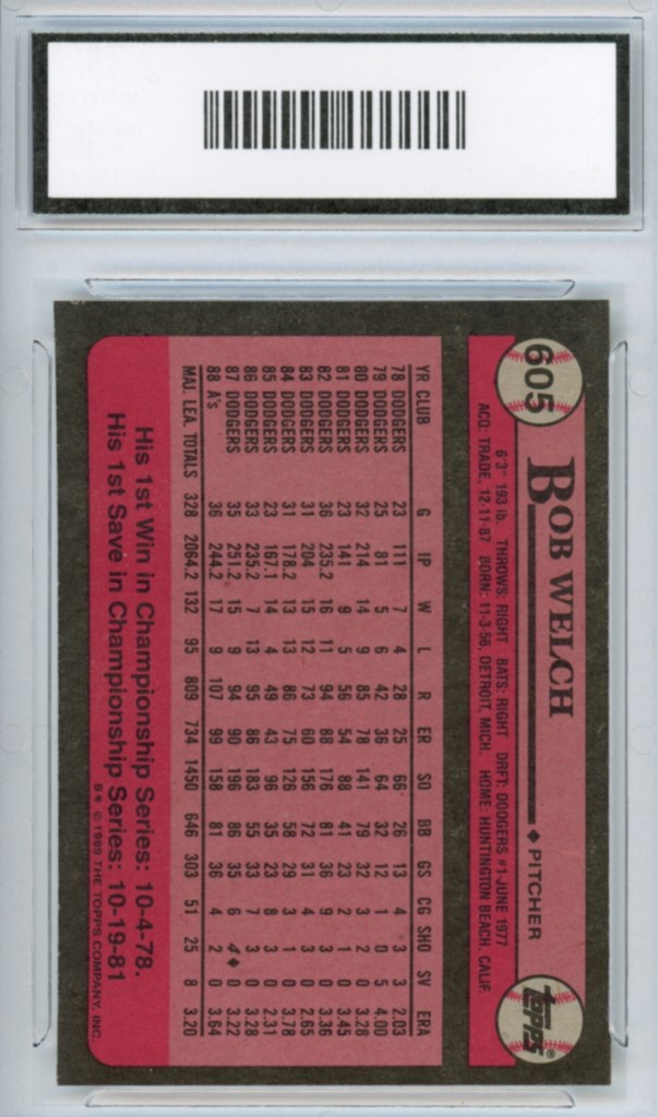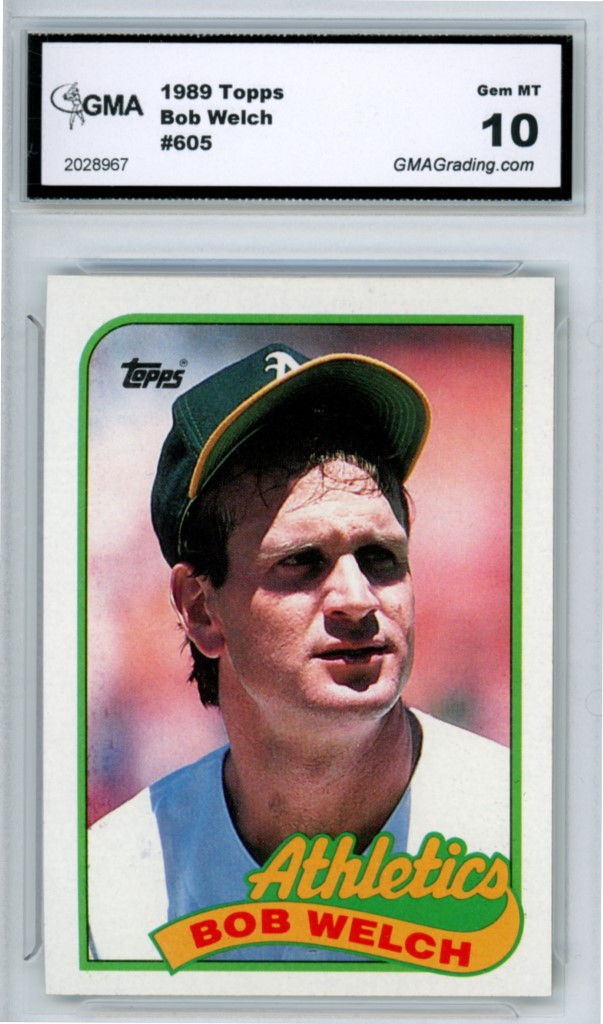 1989 Topps Bob Welch No Stat Line Error on Back Oakland Athletics Baseball Card #605 – GMA Professional Graded 10 Gem MT