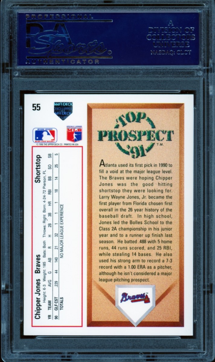 1991 Upper Deck Chipper Jones Rookie Card #55 – Professional Sports Authenticator (PSA) Graded 7 NM Atlanta Braves Baseball Trading Card