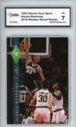1992-93 Classic Four Sport Collection Alonzo Mourning Wooden Award Rookie Georgetown Basketball Card #319 – GMA Professional Graded 7 NM