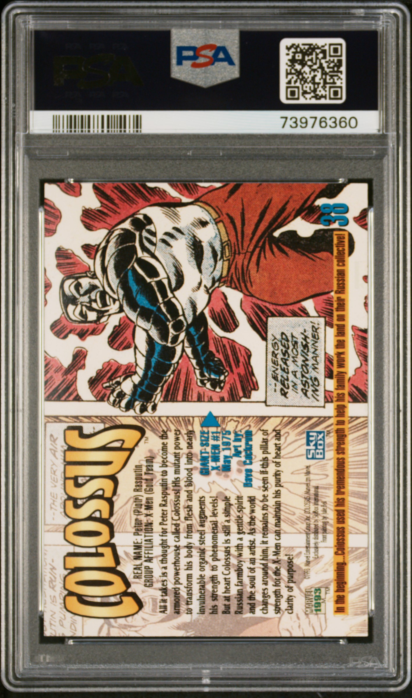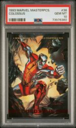 1993 Skybox Marvel Masterpieces #38 Colossus PSA 10 Gem MT Marvel Comics Trading Card – We have multiple graded trading cards from the 1993 Skybox Marvel Masterpieces set for sale. If you are interested in starting your own set or adding to an existing one, visit our store to pick out whichever cards you need while they’re still available!