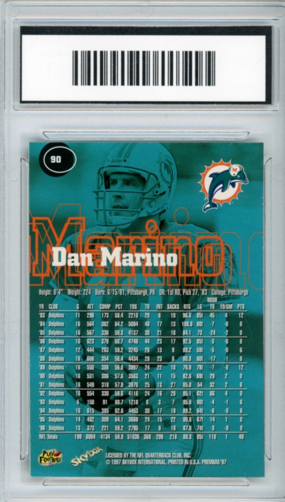 1997 Skybox Premium Dan Marino Miami Dolphins Football Card #90 – GMA Professional Graded 8 NM-MT