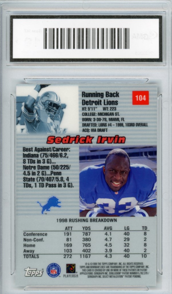 1999 Topps Bowman’s Best Sedrick Irvin Rookie Detroit Lions Football Card #104 – GMA Professional Graded 10 Gem MT