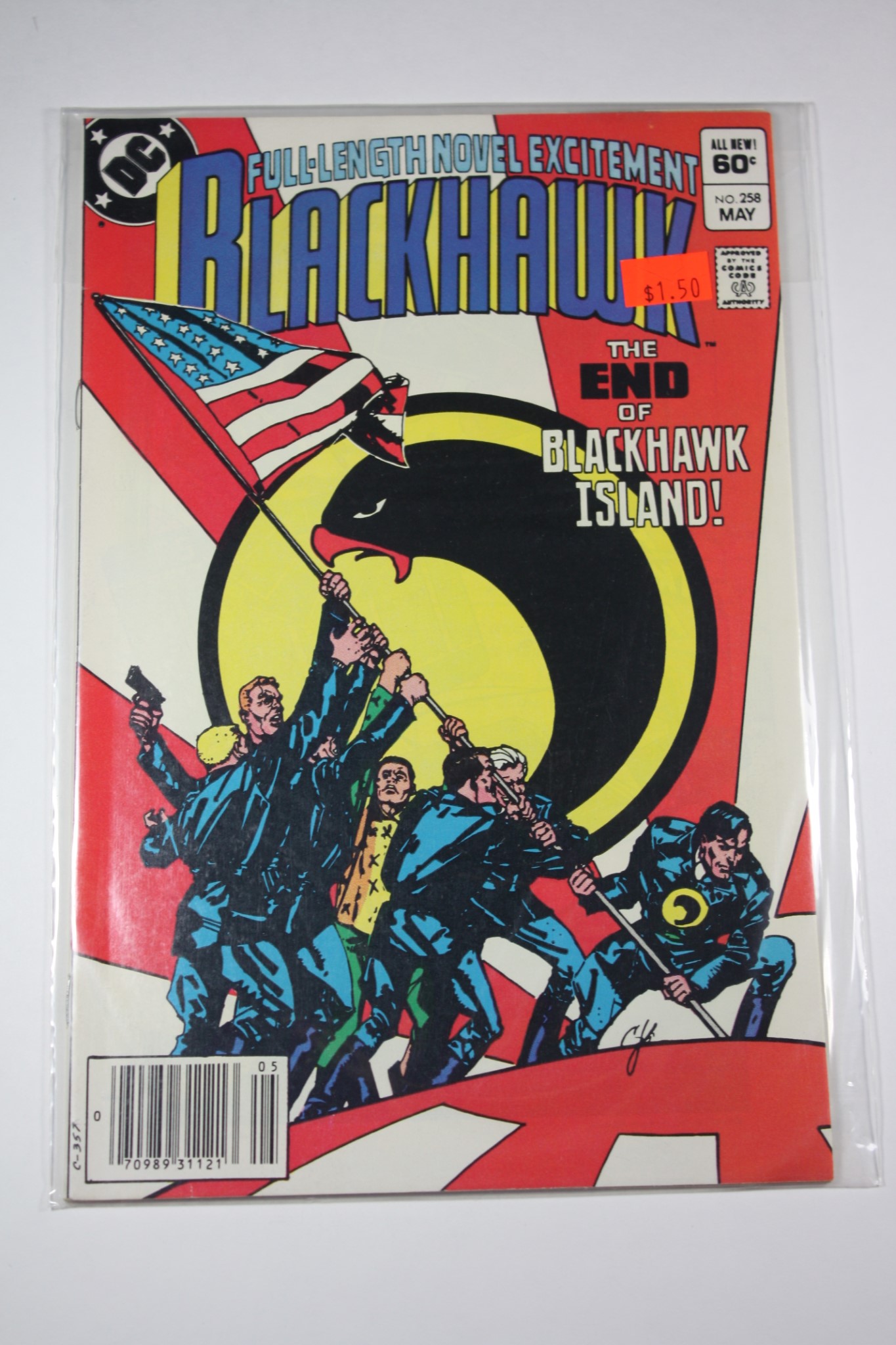 Black Hawk Issue #258 DC Comics 1983 The Death of Blackhawk Island Newsstand Variant Featuring Blackhawk Squadron, Black Hawk, Andre Blanc-Dumont, Chuck Wilson, Hans Hendrickson, Olaf Bjornson, Stanislaus Drozdowski, Chop-Chop & created by Mark Evanier, Howard Chaykin & Dick Giordano.
