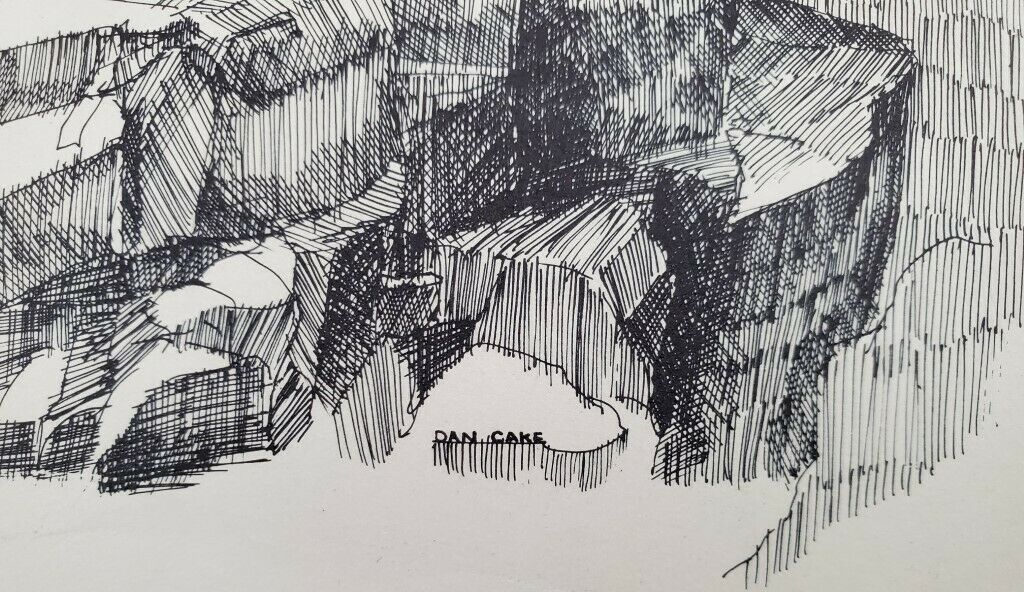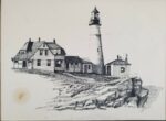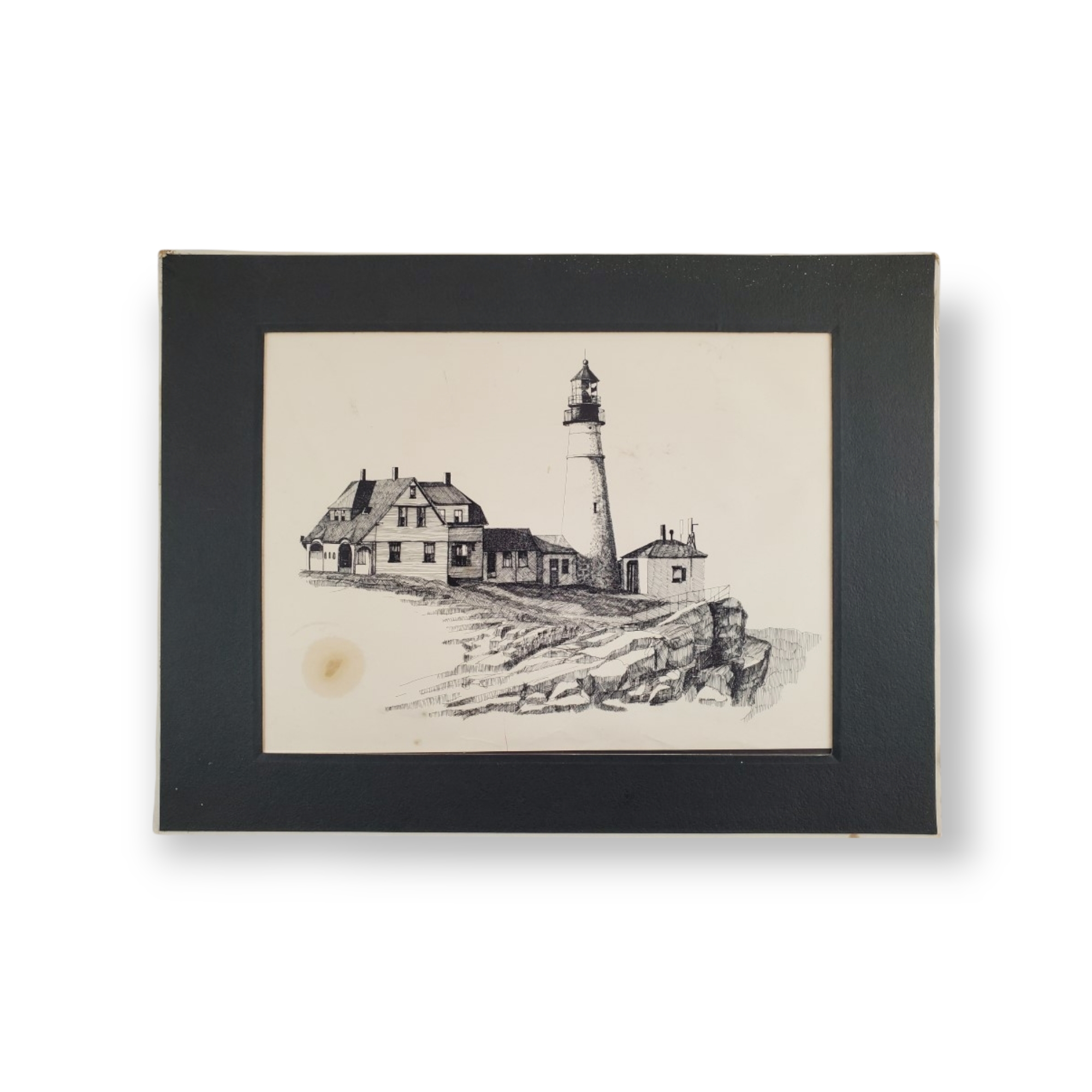 Dan Cake Signed Pen & Ink Light House Art. The piece?itself is 8.5″ x 11.5″ and with the matted frame is 16″ x 12″. Artwork by Maine Artist Dan Cake (1944-2016).?The condition is great but there is a small stain in the lower left hand corner.