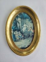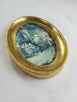 Lovely Woman on Swing Scene Fine Art Print displayed behind glass in a beautiful Gold Leaf Frame. The measurements are 5″ width by 7″ height. This comes from a group of prints that were hand made and framed in Italy.