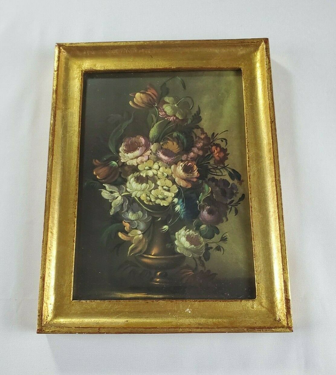 Lovely Scene title Flemish School Flowers of beautiful flowers in a brass vase fine art print. The piece is displayed behind glass in a beautiful Gold Leaf Frame. The measurements are 6.5″ width by 8.5″ height. The back of the frame says A Decorative Craft Florentia Hand Made in Italy with the number 982 written below.