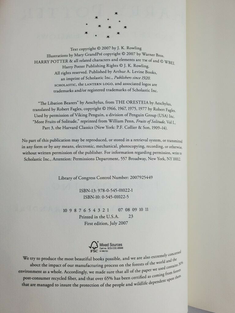 Harry Potter and the Deathly Hallows by J.K. Rowling Hardcover 2007 First Edition 1st Printing. The book is in brand new condition, has never been read and is absolutely flawless front to back. The dust cover and book are pristine, the inside of the book has no creases or marks anywhere. Beautiful addition to any Harry Potter collection.