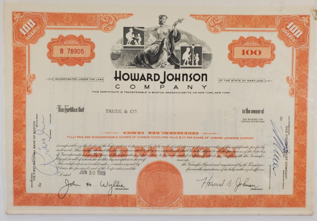 Howard Johnson Company Common Stock Certificate Dated 1969 100 Shares Each $1 Wall Street Stock Market Collectible