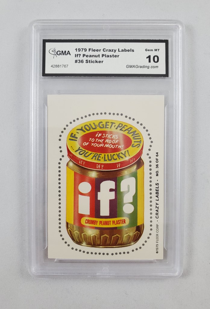 If? Peanut Plaster 1979 Fleer Crazy Labels Sticker GMA Professional Graded 10 Gem MT Card #36
