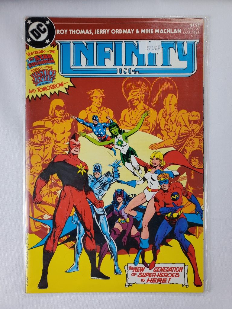 Infinity Inc. Issue #1 DC Comics 1984 Generations! by Roy Thomas, Jerry Ordway, Mike Machlan & Dick Giordano featuring Infinity Inc., Fury, Jade, Northwind, Nuklon, Obsidian, Silver Scarab, Star-Spangled Kid, Brainwave Jr., Justice Society of America.