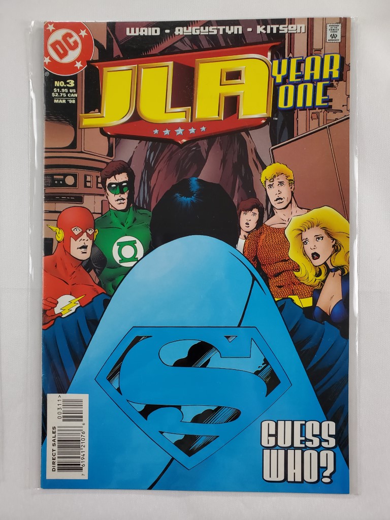 JLA Year One Issue #3 DC Comics 1998 Guess Who? 1st Edition by Mark Waid, Barry Kitson & Mike Carlin featuring Justice League of America, Hawkman, Hawkwoman, Martian Manhunter, The Atom, Batman, Wonder Woman, Green Lantern, The Flash, Superman, Green Arrow, Snapper Carr, Aquaman.