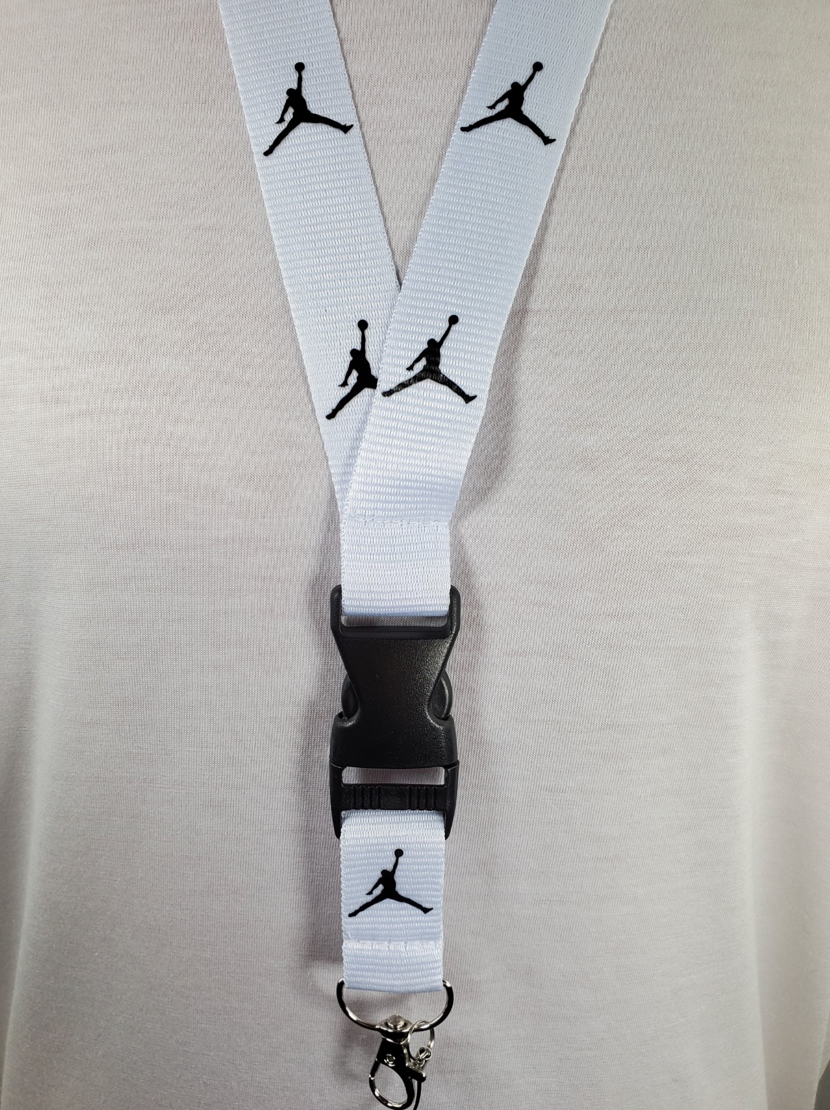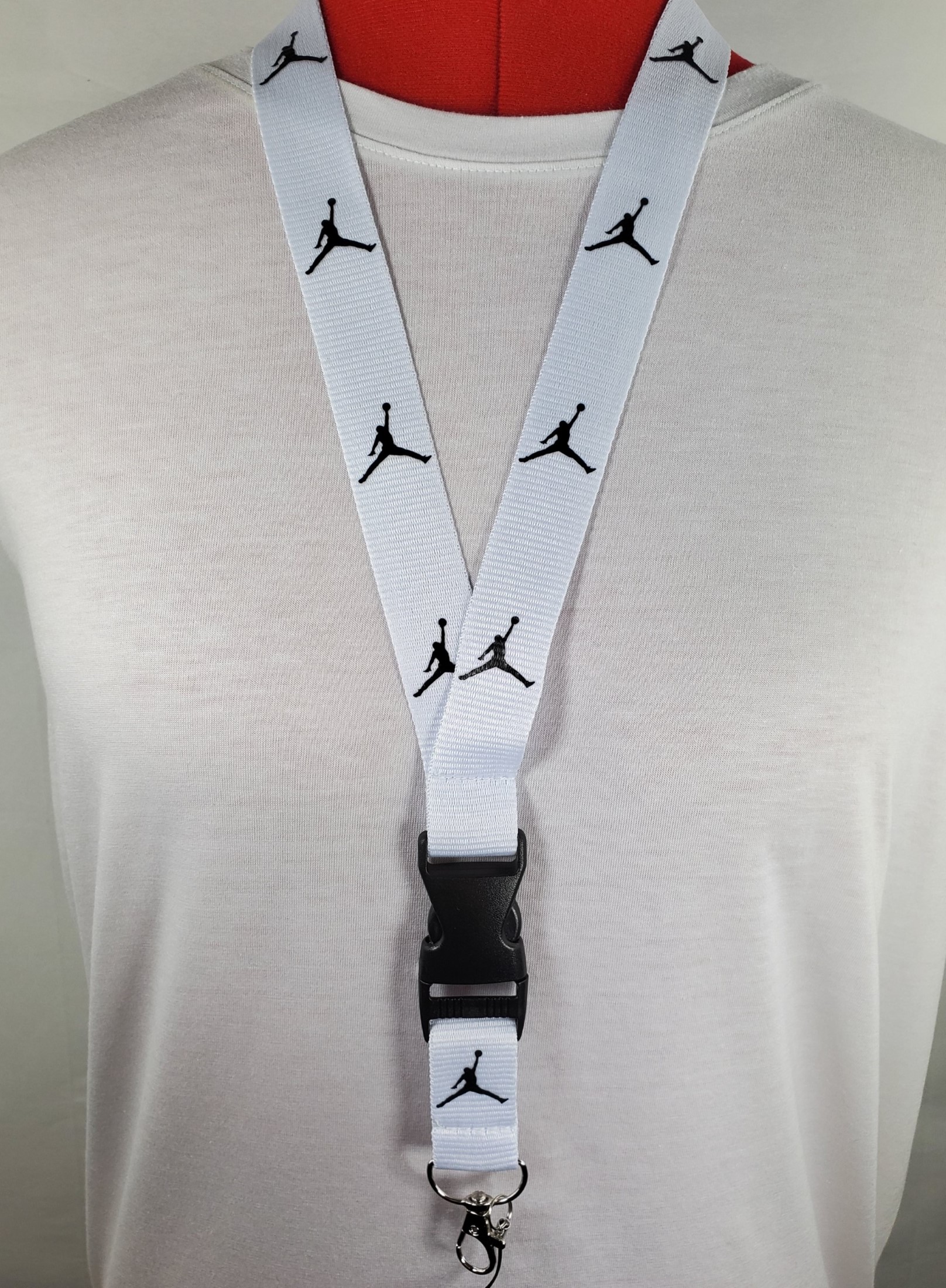 Jordan White & Black Detachable Lanyard and Metal Clasp. Take your game and your work to the next level with this stylish lanyard. The lanyard coloring is white and the logo coloring is black. The lanyard measures a total length of 22 inches (56cm) and a 1 inch (2.5cm) strap width comfortably fitting adults. It features a detachable plastic buckle clip and a metal clasp at the end of the strap which is great for keys, ID’s, badges, name tags, cameras and more! This listing is for a single quantity lanyard per order. Discounts up to 15% off are available for multiple lanyards purchased. Take a look at our other items for sale for additional colors and designs.