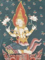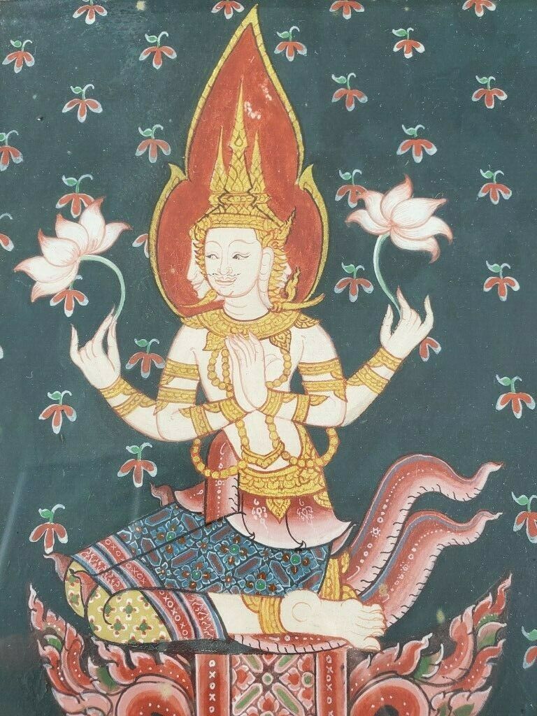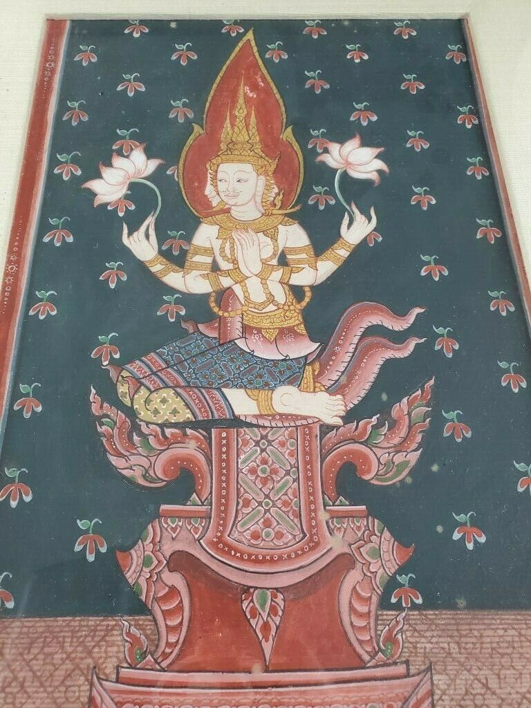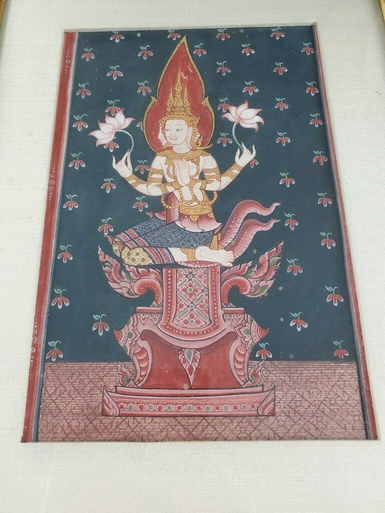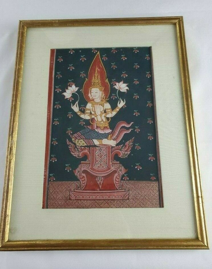 Beautiful Painting of Lakshmi Hindu/Buddhist deity depicted with three faces, four arms & holding two lotus flowers. The painting is matted behind glass in a lovely gold leaf frame and gold paint is used throughout the painting as well. The frame measures 11.5″ x 15″ and the inner piece measures 7″ x 10.5″. There is no signature on the piece. Hindu or Buddhist art is rarely signed by the artist, for the reason that it is considered egoic — which is contrary to their philosophies.