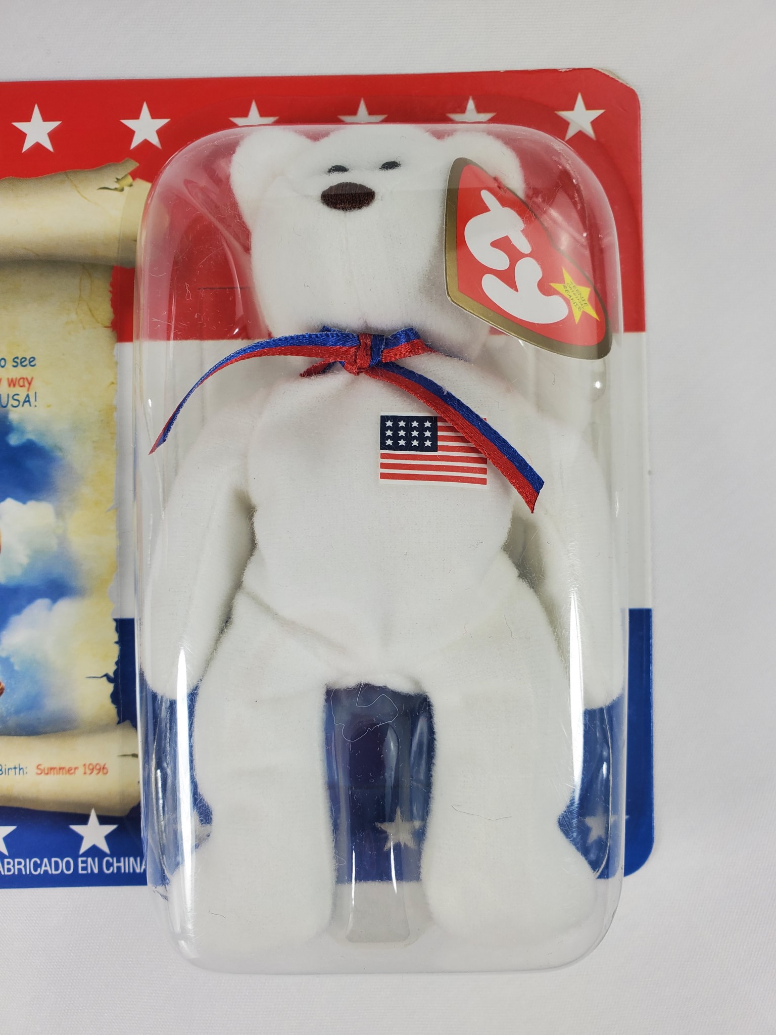 Libearty The Bear Ty American Trio Teenie Beanie Babies McDonalds USA 2000 Promotion Style Number 4057 5″ Bear in original mint condition sealed packaging.