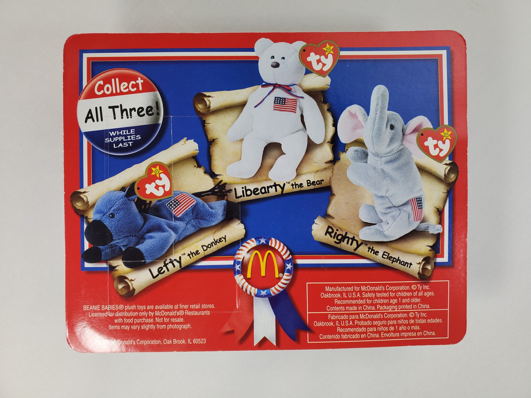The American Trio promotion ran from October 25 through November 9, to coincide with the period of the US elections. These Teenie Beanie Babies were packaged in special boxes and available for $2.49. Each animal in the USA Trio had a poem on its box. Libearty’s poem matched his Beanie Baby poem, but Righty and Lefty had new poems. The boxes are 7.75″ wide by 6.125″ tall. For more Teenie Beanies, Beanie Babies, Attic Treasures, and Beanie Buddies check out our other items for sale.